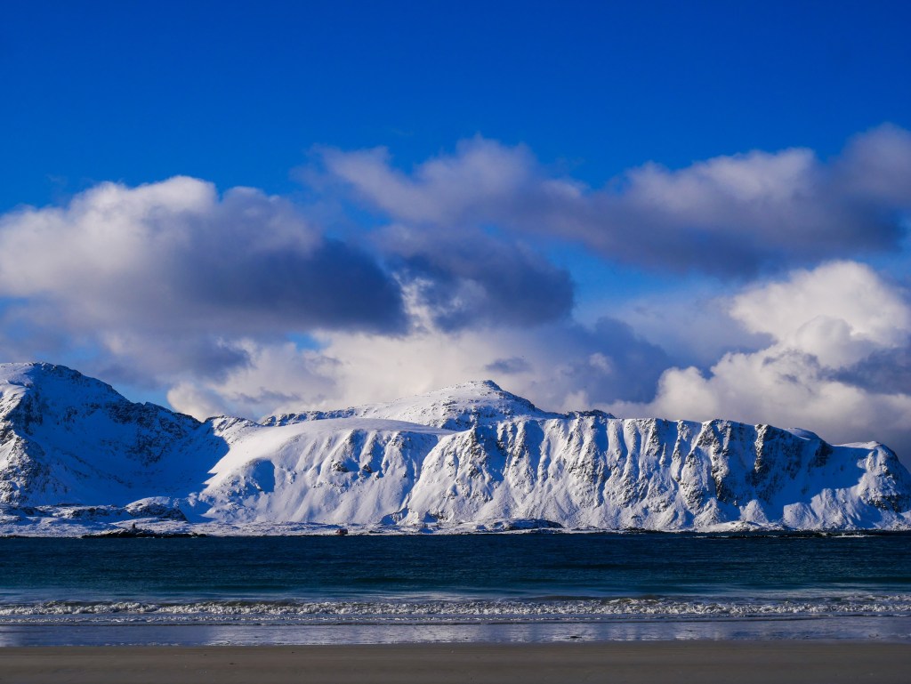 Der nächste Stop sollte dann Nusfjord werden, ein altes Fischerdorf, das heute vor allem als Hotelanlage dient, jedoch noch sehr ursprünglich ist. Wir fuhren vorbei am halb zugefrorenen Flakstadpollen, einem Fjord (?) der umrahmt wurde von vielen beeindruckenden Bergen. Weiter vorbei am komplett zugefrorenen Storvatnet, der auf der Hintour halb in der Sonne und halb im Schatten lag. Kurz noch zu Nusfjord: Es gilt als eines der am besten erhaltene Fischerdörfer und wir schlenderten ein bisschen hindurch. Es bestand, wie fast alle Fischerdörfer, aus den berühmten Rorbuer-Häusern. Doch vor allem die Möwen haben sich des Dorfes angenommen und es in einer großen Vielzahl bevölkert. Auf einem recht großen Felsvorsprung nisteten die Möwen und oben drauf, da konnte man vom Dorf aus hoch krakseln, war der Wind wieder reichlich frisch – ok, arschkalt trifft es wohl eher, so dass wir schnell den Rückzug antraten.
