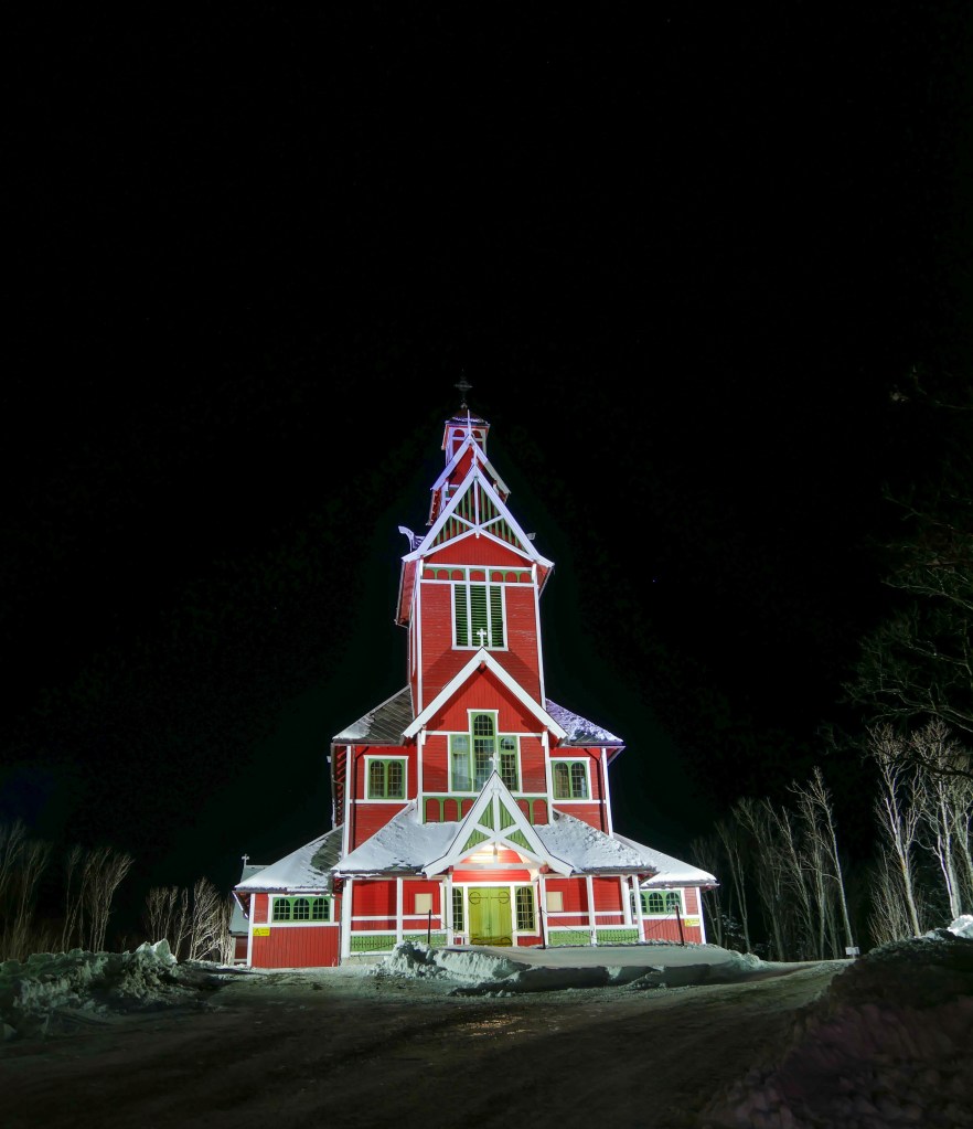 Nachdem das Licht fast erloschen war, setzten wir unsere Fahrt Richtung Hauklandbeach fort, doch hatten dort wenig Glück. Nur viele andere Menschen fanden wir, aber keine Nordlichter mehr. Also fuhren wir zurück zum Hotel, fuhren noch an der Buksnes Kirke vorbei und hielten für ein Foto und lagen dann weit nach 1 Uhr im Bett.