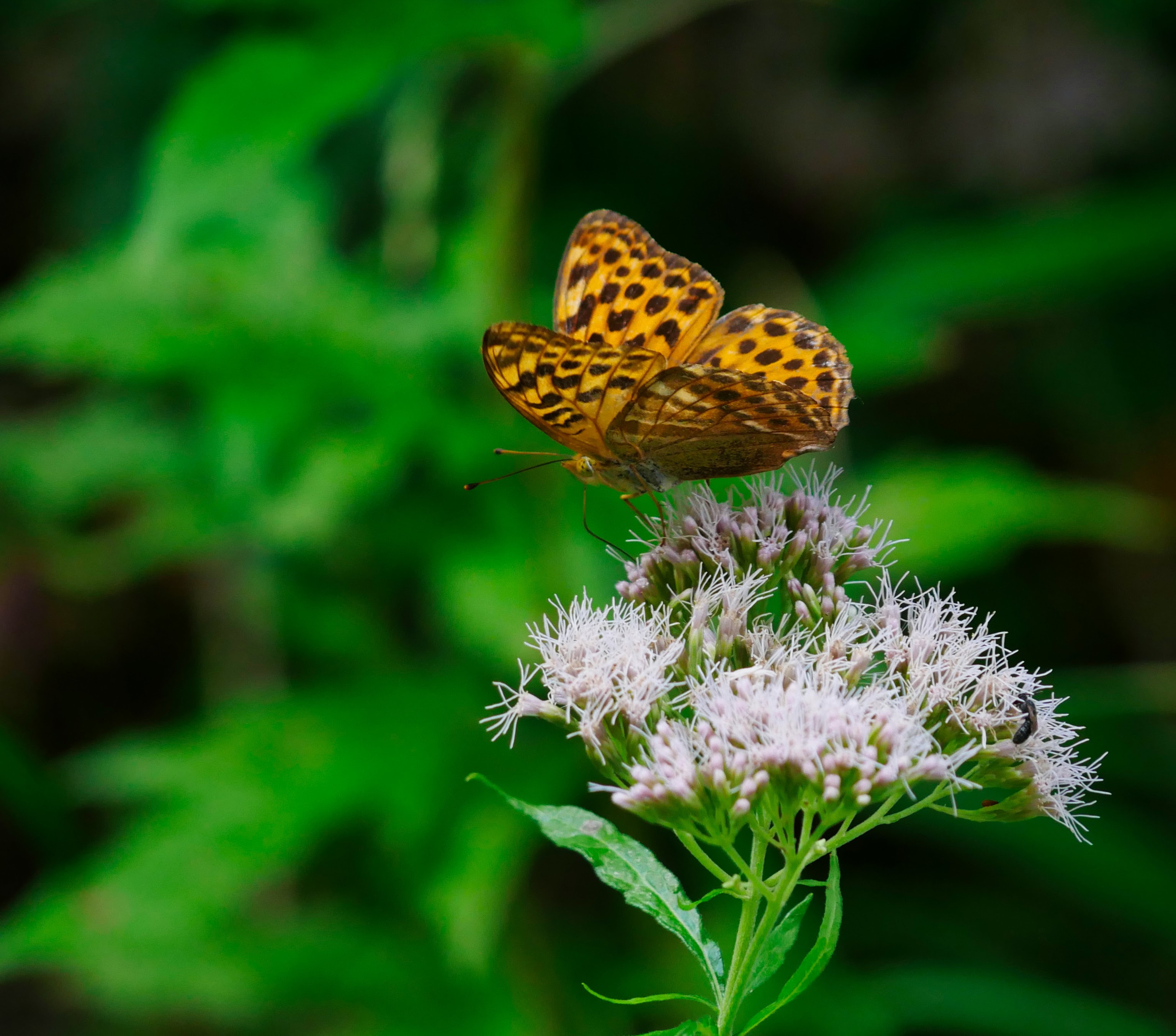 Danach ging es zurück zum Auto und wir hatten als nächstes den „Mittelpunkt der Erde“ auf der Karte. Leider floppte das kolossal, weil wir diesen Punkt einfach nicht finden konnten. Haben wir uns entweder doof angestellt oder irgendwer hat uns auf Google so richtig schön gefoppt. Sei´s drum, wir fanden dafür auf der Karte was anderes. Nämlich den Altenbergturm. Auf dem Parkplatz vor dem Turm waren wir das einzige Auto und wir hatten Glück, es sollte auch oben auf dem Berg nix los sein 🙂 Wir hatten quasi den Turm für uns. Vorher aber mussten wir noch einen kleinen Fußmarsch auf die Bergkuppe absolvieren und wurden umschwirrt von Schmetterlingen. Zum Beispiel vom Kaisermantel, der sich an der großen Blütenpracht austobte oder vom Russischen Bär (keine Angst, ist auch nur ein Schmetterling), der es sich auf einer Blüte bequem gemacht hatte. Anfangs sah der Russische Bär wie eine Motte aus, recht gut getarnt, später zeigte dieser aber sein Unterkleid, das schön rot war und einen tollen Kontrast bot.
