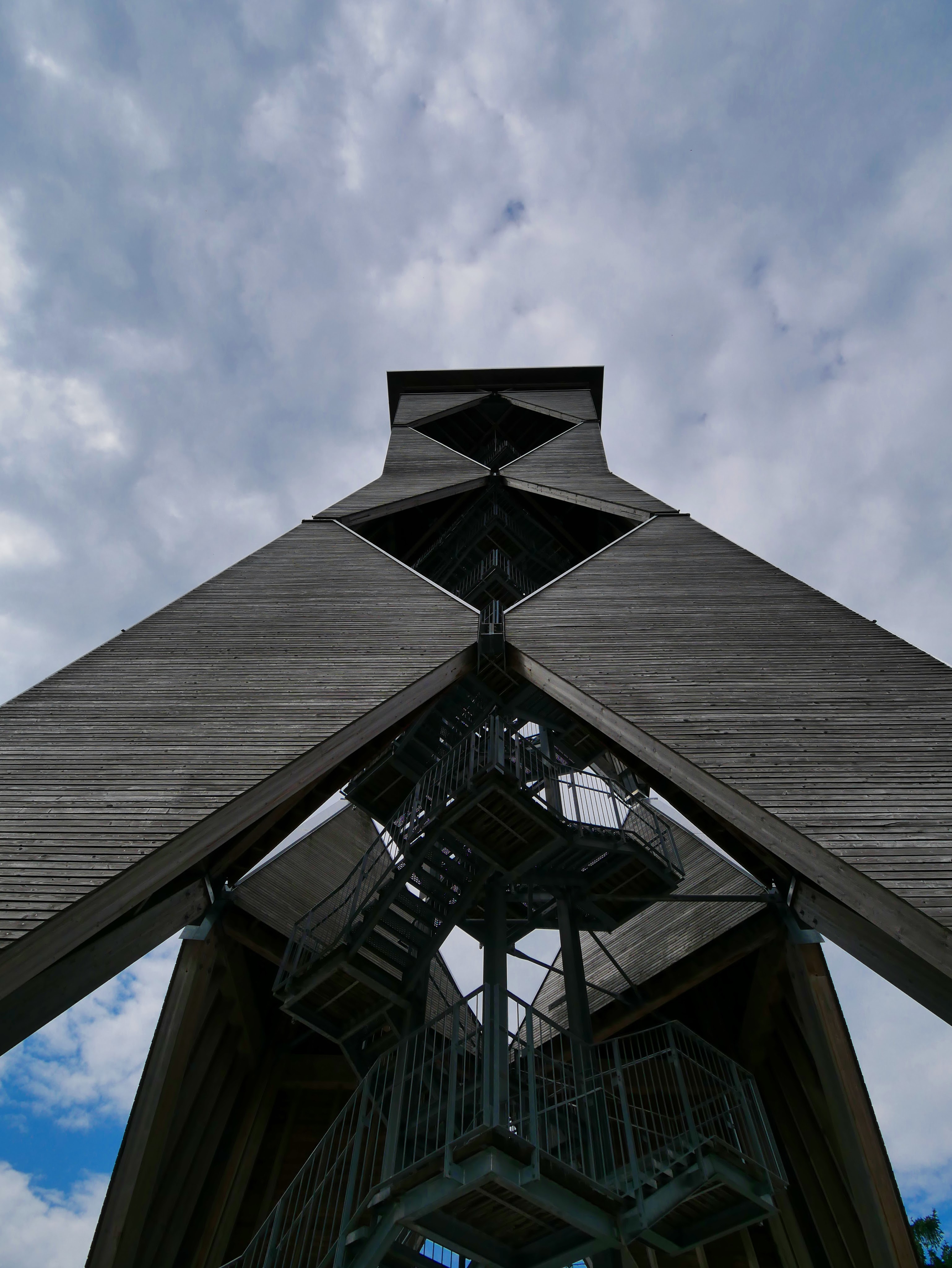 Schon noch ein Stückchen entfernt sahen wir schon den architektonisch recht ansprechenden Turm, der Stefan unbedingt besteigen wollte. Ich war eher für ein NEIN – ICH GEH DA NICHT HOCH zu haben. Am Ende stand ich doch oben, mit schlotternden Knien und zittrigen Händen, aber geschafft und die Aussicht war super. So weit das Auge reicht konnte man Wald, Hügel und kleine Städtchen sehen. Ein Rundumblick der die Mühen des Aufstiegs auf den 36 m hohen Turm vergessen ließ. Das dumme an der Sache jedoch war, dass ich ja auch wieder runter musste. Und das ist nicht so einfach, wenn man eigentlich nicht runtergucken will um durch die Stufen schauen zu können. Ihr wisst schon was ich meine, oder? Zum Glück waren die Stufen nicht komplett aus Gitter und hatte nur kleine Löcher, so dass ich halbwegs unbeschadet wieder festen Boden unter den Füßen hatte irgendwann.