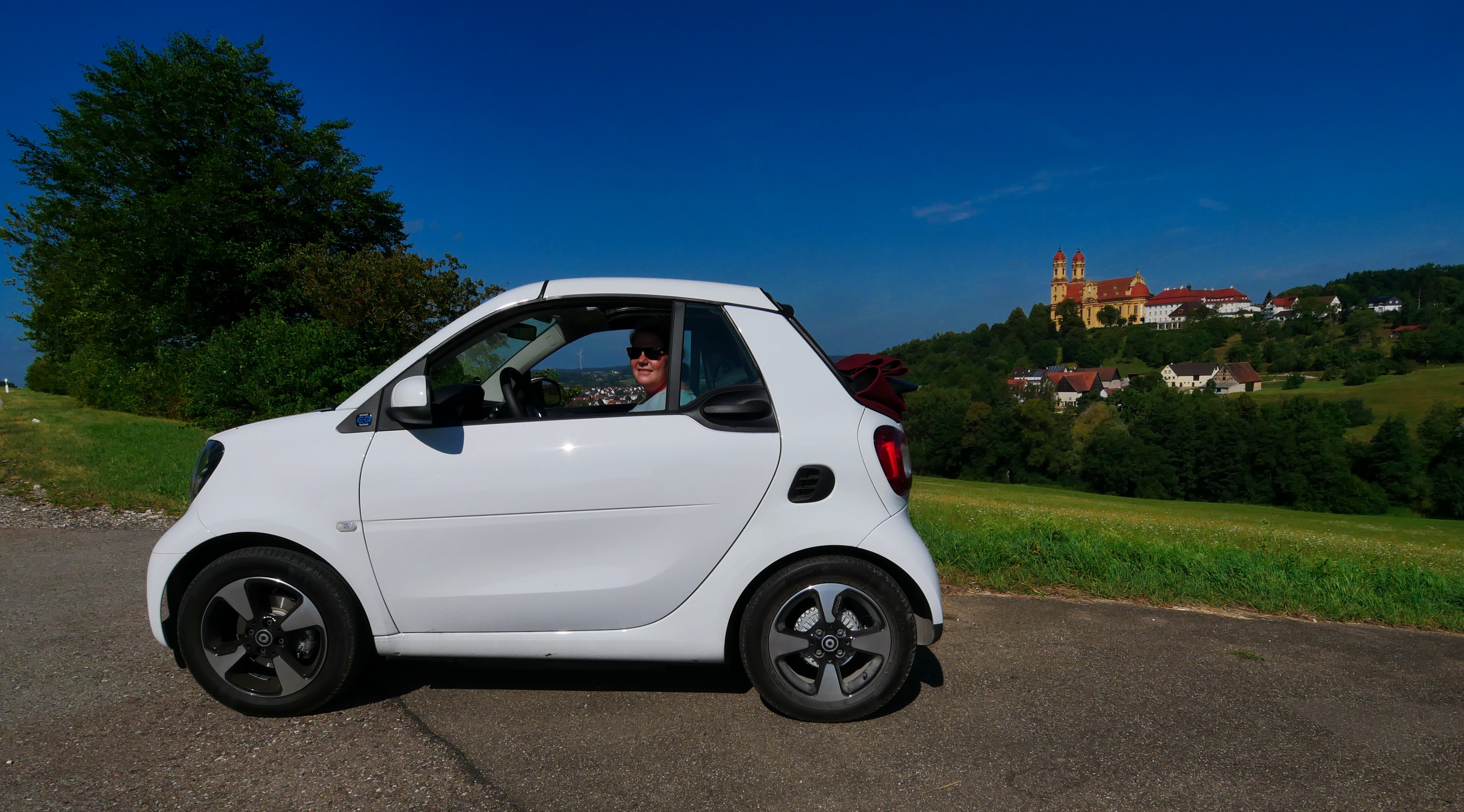 Nach einem guten Frühstück, schnappten wir uns Täschchen und fuhren direkt zur Wallfahrtskirche Schönenberg oberhalb von Ellwangen, da diese um 10 auch schon geöffnet war, im Gegensatz zum Schloss, dass laut Auskunft erst um 10.30 öffnen sollte. Also fuhren wir eine kleine Strecke und sahen schon von weitem die Türme. Komischerweise waren wir nicht alleine, sondern viele Leute kamen mit dem Auto gerade mit uns an. Wir parkten unser Vehikel und liefen den Leuten nach, doch dann standen wir auf einmal auf dem Friedhof. Den Weg wollten wir nun aber nicht gehen, um zur Kirche zu kommen, also bogen wir um und gingen an der Straße entlang und sahen immer mehr Menschen, unter anderem mit Blumen und Klappstühlen bewaffnet. So richtig klar wurde uns erst, was los war, als wir das Schild sahen, auf dem groß drauf stand, dass um 10.30 Uhr Messe ist. Hätten wir uns ja auch gleich denken können. Doch anders als gedacht liefen die Leute nicht in die Kirche, sondern nahmen an einem steilen Hang Platz – entweder auf der freien Wiese, mit Decke und Sonnenschirm oder unter den Schatten spendenden Bäumen. Am unteren Ende des Hangs war eine kleine Bühne aufgebaut, von wo aus der Gottesdienst abgehalten wurde. Noch bevor dieser offiziell los ging schlüpften wir in die Kirche und schauten uns, durchaus staunend, um. Neben der Deckenbemalung war vor allem die offene Krypta eher ungewöhnlich. Wieder draußen gesellten wir uns an den Rand der Bäume und sahen noch den Einzug des Priesters und zogen dann weiter Richtung Schloss ob Ellwangen.