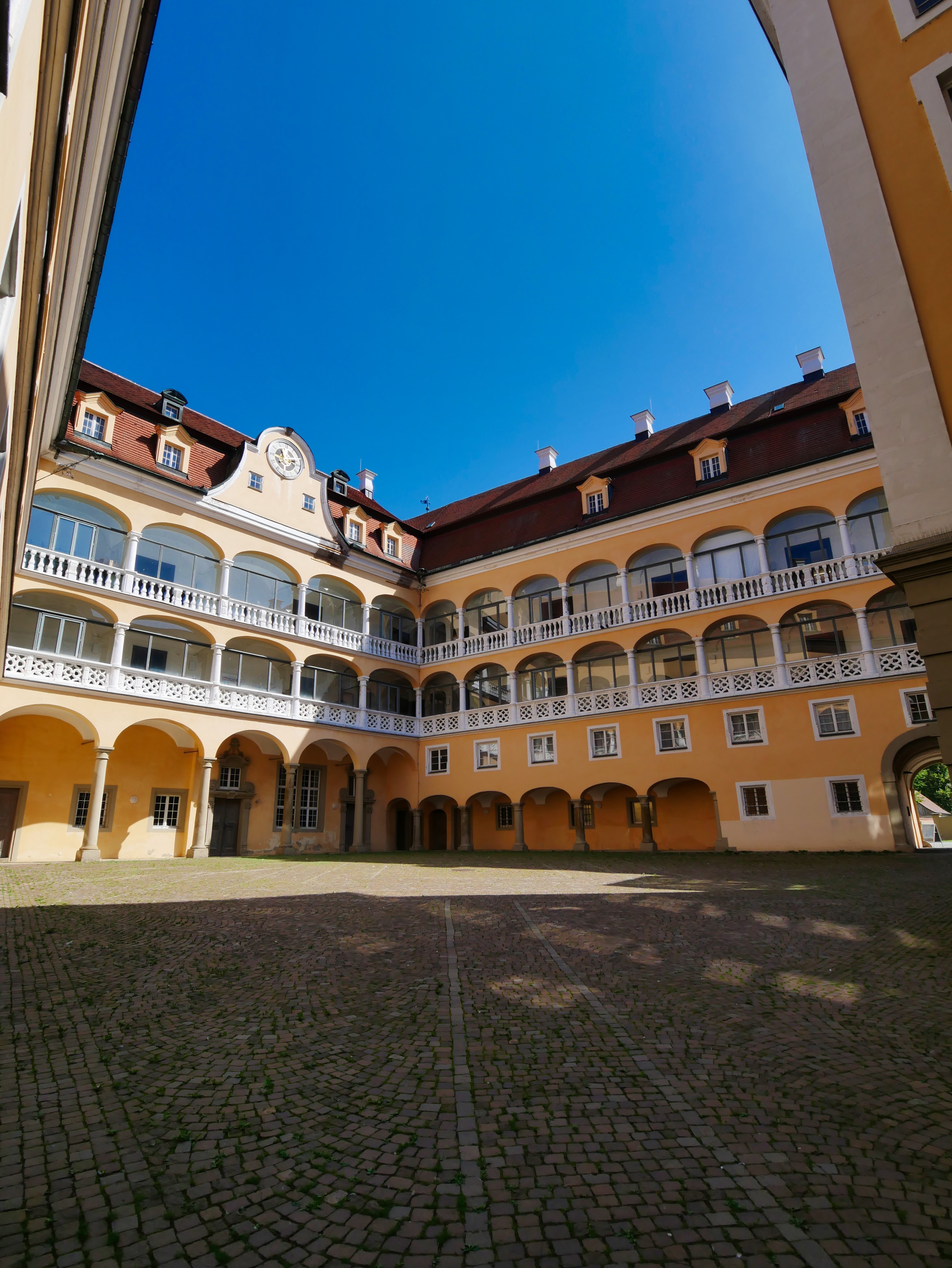 Da wir im Hotel keinen Außenplatz für das Abendessen bekamen, sind wir zurück nach Ellwangen gefahren und haben dort unser Auto an die Tankstelle gebracht und sind in der kleinen Innenstadt rumgestreunert und haben uns unter anderem die evangelische Jesuitenkirche, die direkt an die Basilika St. Vitus angrenzt und durch eine Verbindungstür miteinander verbunden sind, angeschaut. In die Basilika konnten wir zu „später“ Stunde nicht rein, da dort ein Gottesdienst lief. Fand ich jetzt etwas schräg am Samstagabend, aber mir fiel dann am Sonntag ein, das ja Mariä Himmelfahrt war. Also wird es schon einen Grund gegeben haben für den späten Gottesdienst. Da man diesen auch nicht stört, sind wir weiter gezogen vorbei am Amtsgericht, das in einem sehr alten Gebäude untergebracht war und an vielen weiteren hübsch hergerichteten Häuschen bis wir einen Platz in einem Restaurant ergattert hatten. Dort aßen wir dann gemütlich zu Abend und suchten anschließend noch den Eisladen, wo die Leute selbst um die später Uhrzeit noch anstanden. Mit dem Eis in der Hand ging es dann zurück ins Hotel, wo wir dann auch auf der Terrasse den Abend gemütlich bei einem Glas Wein ausklingen lassen konnten.