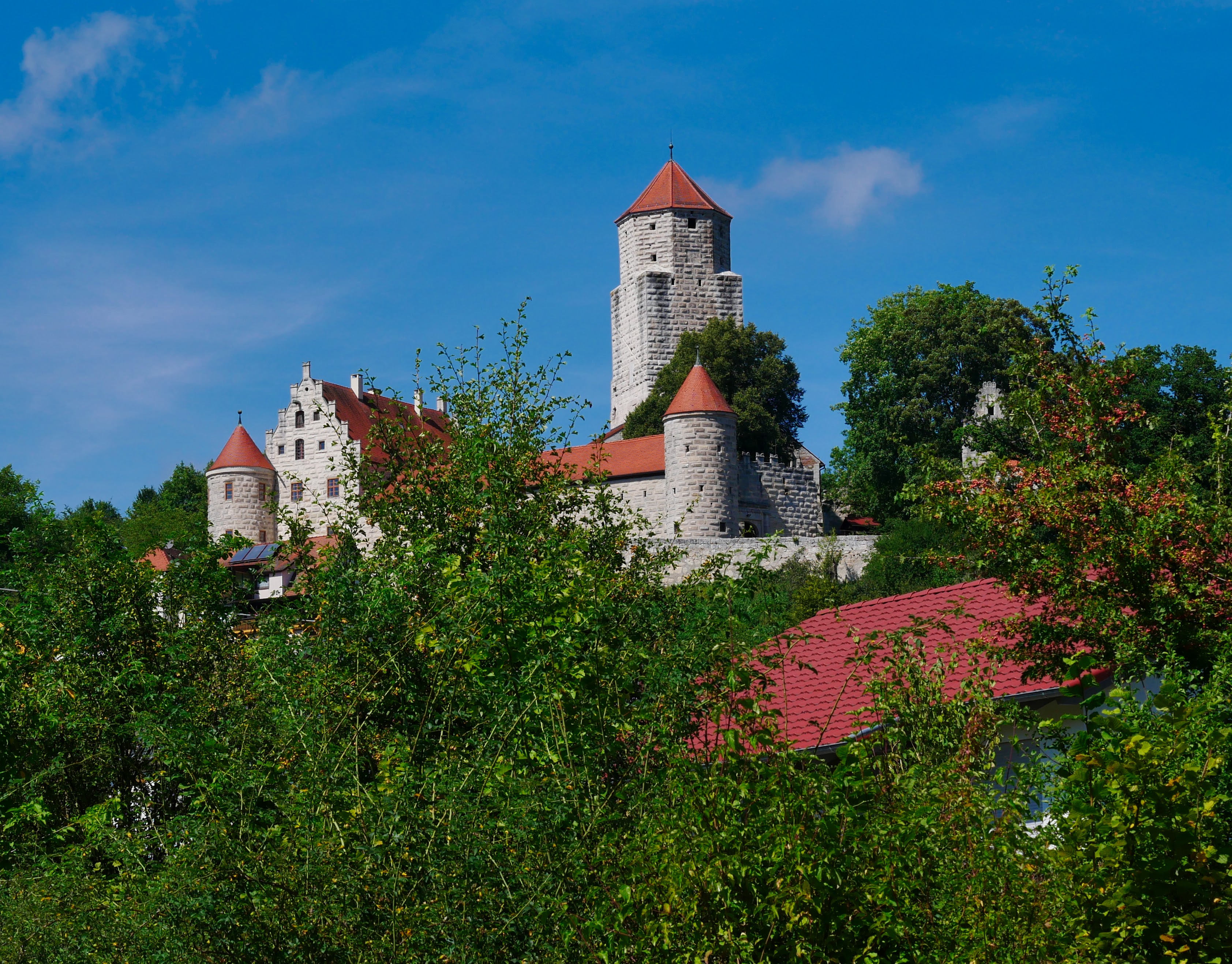 Nun denn, wir wollen ja niemanden mit langweiliger Geschichte – oder doch nicht – behelligen, deswegen hopsen wir weiter Richtung Ellwanger Innenstadt zum Zweiten. Denn die Basilika war am Vortag durch einen Gottesdienst nicht zugänglich, also versuchten wir es am Sonntag nochmal und hatten Glück und konnten uns in Ruhe umschauen. Danach gab´s noch einen Abstecher in die Eisdiele und dann ging es auch schon weiter, denn wir hatten noch ein zwei Ziele in der Umgebung auf dem Zettel. Zum Beispiel Schloss Fachsenfeld. Vorher kamen wir aber durch Zufall an einer Burg in Niederalfingen vorbei, die wir eigentlich aus dem Augenwinkel auf dem Berg erspäht hatten. Wir fuhren die 18% Steigung mit unserem Flitzi hoch und schauten uns in der recht gut erhaltenen Burg um, die unter anderem auch als Jugendherberge dient.