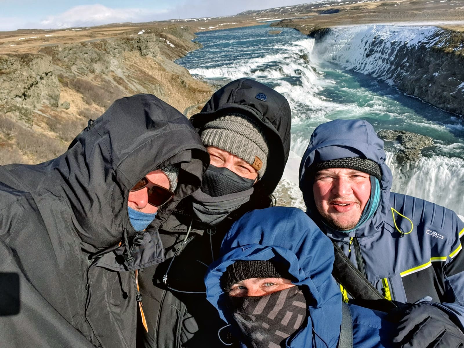 Den Kampf haben wir an dieser Stelle auf jedenfall gewonnen, so dass wir gemütlich weiter mit „Susi“ Richtung Gullfoss reiten konnten. Warum das Auto Susi heißt? Keine Ahnung, vielleicht weil Susi schon a bissl abgenutzt ist und ein bisschen Ermüdungserscheinungen hat? Na jedenfalls hat uns Susi heil auf den Parkplatz beim Gullfoss gebracht und siehe da, der Parkplatz war fast komplett leer. Auf der oberen Ebene brauchten wir nicht ganz so argh mit den Türen kämpfen, aber als wir (nachdem wir noch einen kurzen Check im Souvenirladen eingeschoben hatten) dann den Weg an die erste Aussichtsplattform machten – verdammte Axt – die -8° fühlten sich eher wie -15° oder noch weniger an. Wie Nadelstiche fuhr es uns in die Hände, allen voran unsere Männer, also wir sowohl das Selfie als auch das Gruppenselfie schossen. Und auf dass die Handys nicht umhergeflogen sind. Aber auch ich hatte einfach nur Eishände, versuchte durch den Sucher zu schauen, aber das war eher ein blindes Fotografieren, da der Suche schon beim rangehen beschlug. Mein Mund-Nasen-Schal war schon weiß beschlagen, da der Atem direkt am Schal fror. Und der Wind, es war so kalt. Und wir waren jetzt nicht wirklich dünn angezogen. Aber da, wo die Haut rausblitzte (also vornehmlich im Gesicht), frierte alles ein. Davon mal ab, dass wir auch noch ordentlich rumgeschoben wurden von den Böen. Doch eisern wie wir waren, wagten wir uns noch an einen anderen Ausguck, von wo man in Schlucht, die vermutlich durch den Wasserfall selbst geschaffen wurde, reinschauen konnte.