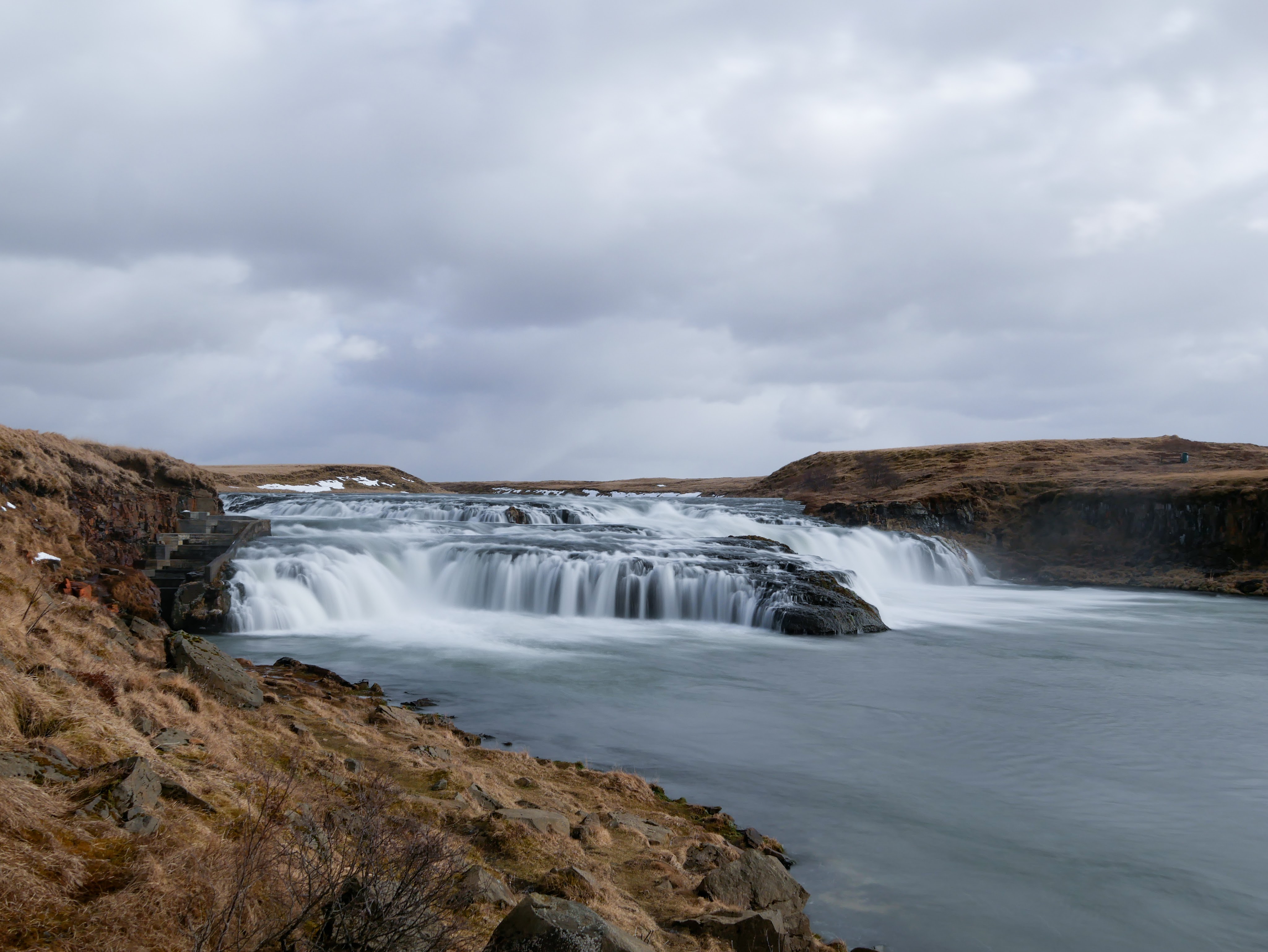 An dieser Stelle noch schnell ein bisschen Wiki-Wissen zum Gullfoss: Der Gullfoss (Goldener Wasserfall) ist ein Wasserfall der Hvítá (ein Fluss der im Hvítárvatn entspringt) und – der fleißige Leser hier weiß das natürlich schon – über zwei Ebenen einen stufigen Verlauf hat. Insgesamt überwindet der Gullfoss knapp 30m. Auf der ersten Stufe sind es 11, auf der zweiten 21m und fließt dann durch eine etwa 70m tiefe und 2,5km lange Schlucht weiter. Nicht zu vergessen, das Wasser der Hvítár und der Gletscherläufe funktioniert hier wie eine Art Fräse, denn jährlich mops der Fluss der Schlucht 25cm, die wird also immer etwas breiter und tiefer. Ich würde aber lügen, wenn ich behaupte, dass ich den Unterschied erkennen könnte :-). In den 19xxer war die Schlucht zweimal komplett mit Wasser gefüllt, so dass die untere Stufe des Gullfoss quasi nicht mehr sichtbar bzw. existent war. Doch das war lange vor unser Zeit zwischen 1930 und 1950.