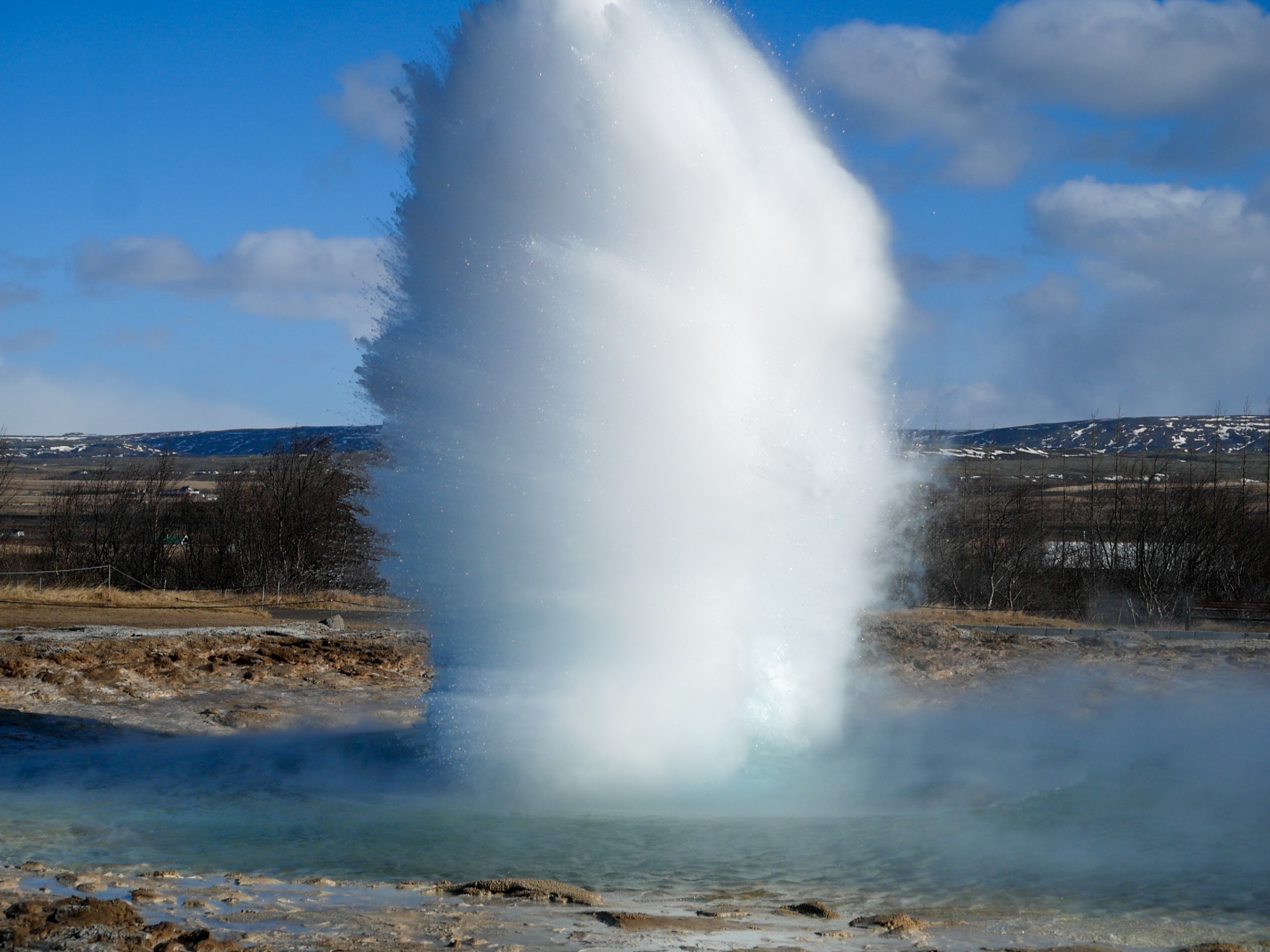 Aber nun genug dazu, auf zum Geysir – dem Gebiet, wo mehrere der heißen Quellen mit bis zu 100 Grad liegen. Hier ist nicht nur der Strokkur beheimatet, sondern auch der kleine Geysir, der in aller seelenruhe vor sich hinwabert. Bereits als wir auf dem Weg zum Gebiet waren, sahen wir die erste Wasserdampfsalve des Strokkur. Doch als wir näher kamen, schwieg der Geysir erstmal eine Weile. Wie angewurzelt standen wir vor dem Geysir, bibberten und warteten um dann zu spät auf den Auslöser zu drücken. Die Dampfsäule war beim ersten Mal auch eher ein Wölkchen, denn statt volle Lotte 20m hoch zu steigen, verpuffte er recht klein, dafür aber breit, da der Wind sein übriges tat. Vom Ansturm des letzten Besuchs war aber auch hier nicht viel zu sehen, bis auf ein paar vereinzelte Menschen verirrte sich hier auch niemand hin. Nach dem kleineren Puff, liefen wir zum großen Geysir, der aber nun schon recht lange schläft. Er ist zwar aktiv, bricht aber nur sehr selten aus. Im Übrigen hat der Große Geysir schonmal eine Fontäne rausgelassen, die über 120m hoch war. Das ist schon ordentlich 🙂 Doch am gestrigen Tag wollte er das wohl nicht und so strich der Wind ein paar kleine Wellen über die Quelle, doch mehr tat sich nicht. Wir schauten uns auch noch die umliegenden, ebenfalls schlafenden Quellen an, die an den Rändern schöne Ablagerung des Schwefels in weiß hinterließen. Teilweise konnte man sehr tief hinein sehen, aber es regte sich nichts. Also stiefelten wir wieder zum Strokkur, dem Butterfass zu deutsch, und warteten auf den nächsten Schub, der auch kam, doch war der Finger am Auslööser quasi eingefroren und ich konnte die Serienbilder nicht anschauen und dachte, ich hätte den Ausbruch nicht geschafft. Im Nachhinein hatte ich ihn aber schon mit der Kamera aufgenommen, zumindest einen Teil. Neben einem höheren, schoss er noch zwei weitere, die aber dann doch eher wieder flach und in die Breite gingen. Wie das ganze dann aussieht, könnt ihr in der Galerie anschauen, wir haben ein Gif zusammengestellt. Ist also fast wie ein Video. Viel Spaß!