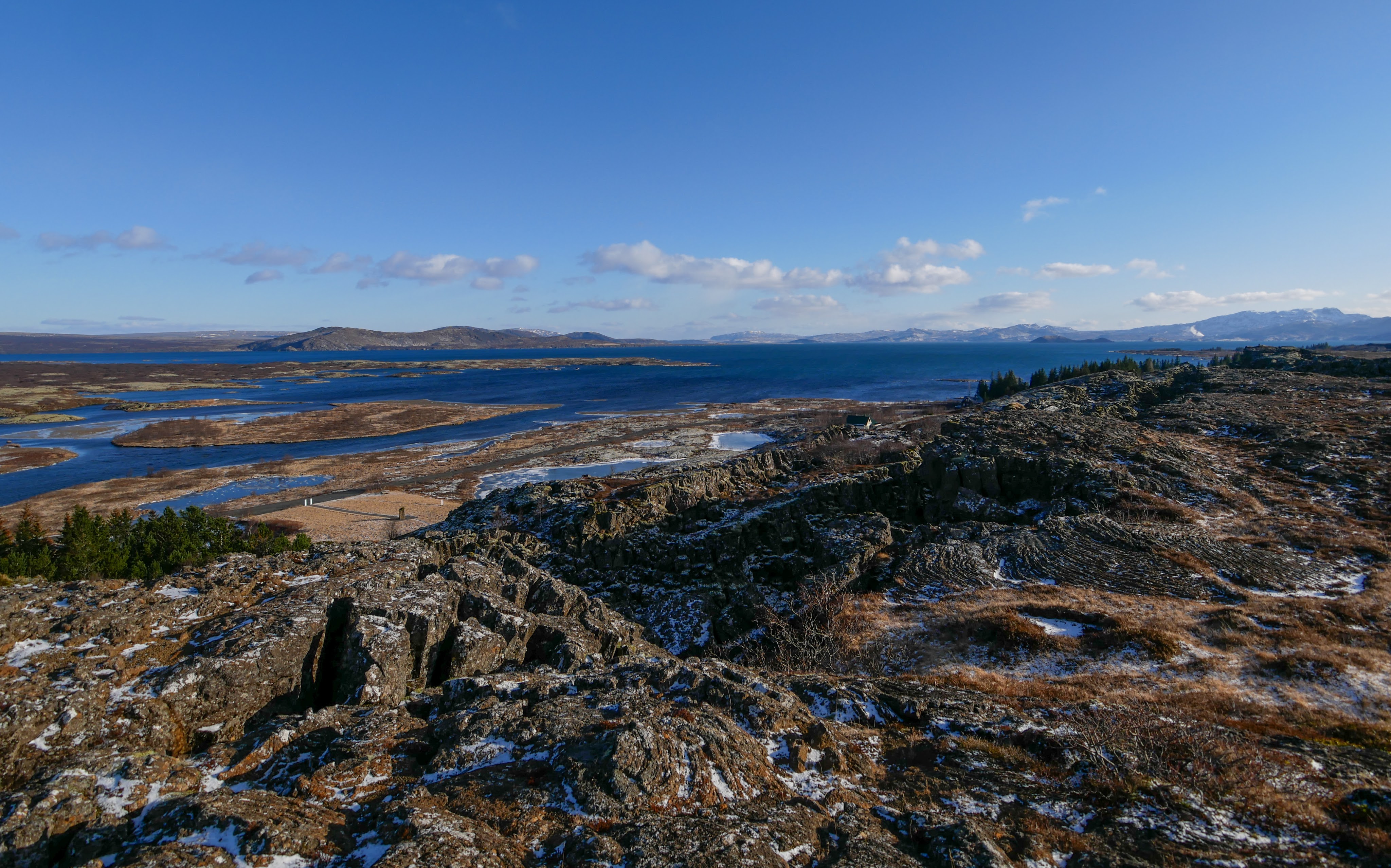 Nun waren wir aber vollends durchgefroren, die dicken Beinchen und der Bobbes wollten ums Verrecken nicht mehr warm werden, doch wir mussten weiter. Reykjavik war ja unser Endziel. Also stoppten wir nochmal kurz im Thingvellir Nationalpark, wo wir unter anderem kurz aus dem Auto hüpften um uns die Silfra-Spalte anzuschauen. An dieser Stelle driften die zwei Kontinentalplatten Amerika und Eurasien auseinander und in dem 2-3° kalten Wasser kann man normalweise tauchen. Natürlich nur in einem fetten Neoprenanzug. Heute war hier aber niemand zum tauchen, zumal ja auch Feiertag war. Nach zwei Minuten flüchteten wir wieder ins Auto und wollten noch einen Abstecher zur Allmännerschlucht (Almannagjá) machen. Nachdem wir erst bisschen mit dem Auto rumgeirrt waren, sind wir doch vom oben gelegenen Parkplatz runter gelaufen und zu der Stelle, wo die Republik Island ausgerufen wurde und vor langer langer Zeit die Volksversammlungen statt fanden. Also ja, wir sind bei der **** Kälte auch noch rummaschiert. Davon mal ab, dass wir auch hier wieder völlig alleine waren, konnten wir darüber hinaus auch einen tollen Blick über Thingvellir genießen, das noch knapp in der Sonne lag und die dunkelblauen Wasserläufe des Öxara und den Þingvallavatn zeigte und die in der Sonne glitzerten.