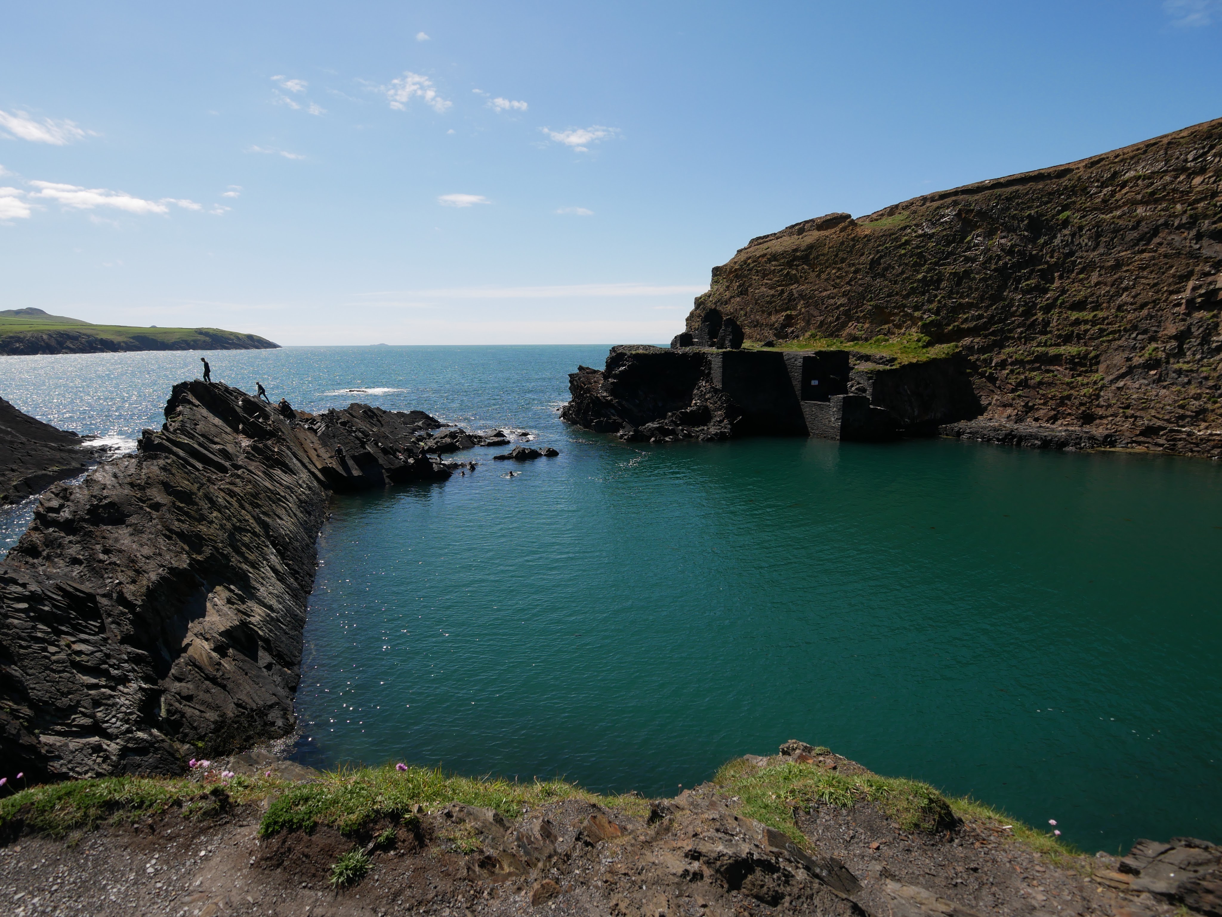 Danach ging es dann aber wirklich zur Blue Lagoon bzw. dem Abereibdy Strand. Ein schöner Strand, aber auch eher steinlastig. Aber es gab eine kleine Wanderung, um die Bucht herum und schwups, stand man auch schon an der blauen Lagune. Eine Bucht in der Bucht sozusagen, wo es einen kleinen Zugang zum Atlantik gab, der das Becken füllte. So um die 15 waghalsige Jugendliche schwammen auf die andere Seite, wo eine Ruine stand. Dort konnte man, wenn man gut einen an der Waffel hatte, sich in das kühle Nass schmeissen. Fast alle trugen einen Neopren-Anzug, nur zwei meinten, dass man den bei den Wassertemperaturen nicht braucht. Aber gefühlt hat der Waliser an sich ein anderes Kälteempfinden als wir. Während wir in dicken Jacken rumrennen, ist 15 Grad bei denen Hochsommer, bzw. T-Shirt-Wetter 🙂 Da wirds einem schon kalt beim zusehen. Und nicht nur die Jugendlichen genossen das kühle Nass, auch eine Gruppe von kleinen Kindern (so um die 8-12) gings ins Wasser. Ob die dann auch von der Plattform sprangen, kann ich nicht sagen, da wir vorher wieder zurück zum Auto gegangen sind. Aber verrückt ist das schon!
