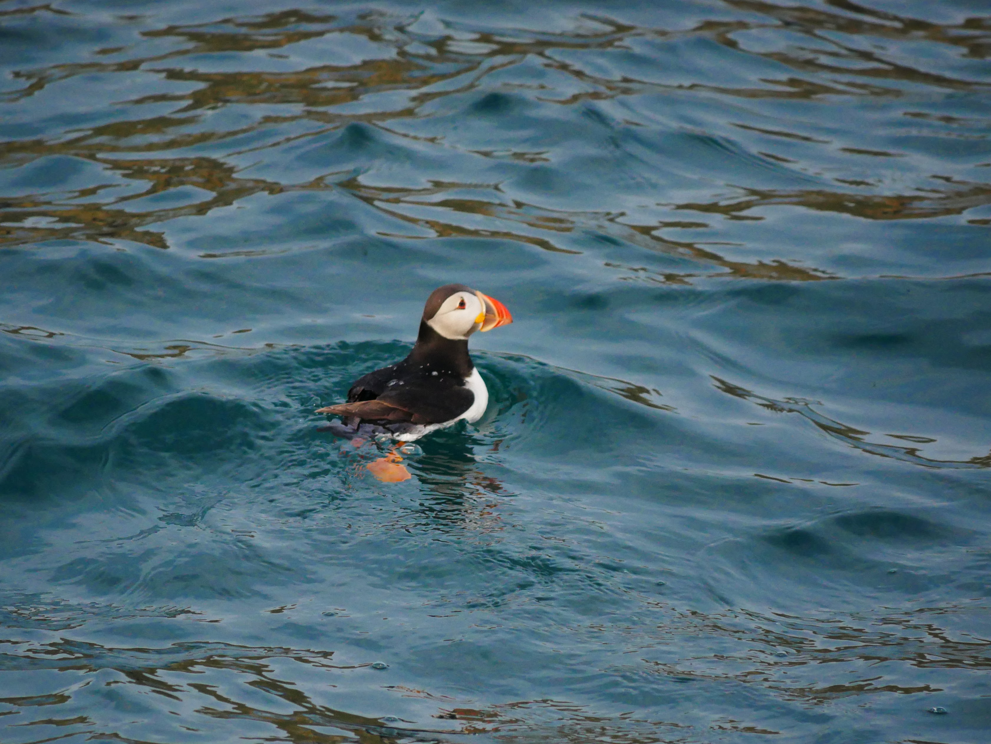 Noch recht am Anfang der Fahrt konnte ich einen Gannet bzw. Basstölpel sehen, aber fürs Foto war ich schon gar nicht gerüstet. Aber es sollte ja heute vor allem auch um die Papageientaucher gehen. DIe waren aber wirklich blitzschnell, so dass sie direkt den Kopf unter Wasser steckten, auftauchten und losliefen, als das Schiff auch nur ansatzweise in ihre Nähe kam. Von allen Seiten flogen sie über unsere Köpfe, und dazwischen mischten sich immer wieder Trottellummen, die hier ebenfalls ihre Brutstätten haben. Bis auf Skomer Island, eine vorgelagerte Insel, konnten wir bis jetzt keine weitere Kolonie in Wales sehen/finden und eigentlich ist das auch ganz gut. Man hat es wohl in der Vergangenheit (schon sehr lang her) nicht gut gemeint mit diesen kleinen Vögeln, die so tollpatschig übers Wasser laufen und deren Landeanflug wirklich an Komik kaum zu überbieten ist. Und da wären wir auch schon wieder bei den Wingsuits. Sowohl die Papageientaucher als auch die Trottellummen sind sehr ähnlich beim Anflug an die Küste oder auf das Wasser: Arme/Flügel zur Seite ausbreiten und die Beinchen auch von sich strecken und schon hat mein eine gute Fläche um gut landen zu können. Es sieht einfach urkomisch aus. Leider bleibt es dabei, sie sind einfach super schnell und es ist nicht so einfach ein ordentliches Bild zu ergattern, aber ein sind doch ganz gut geworden: