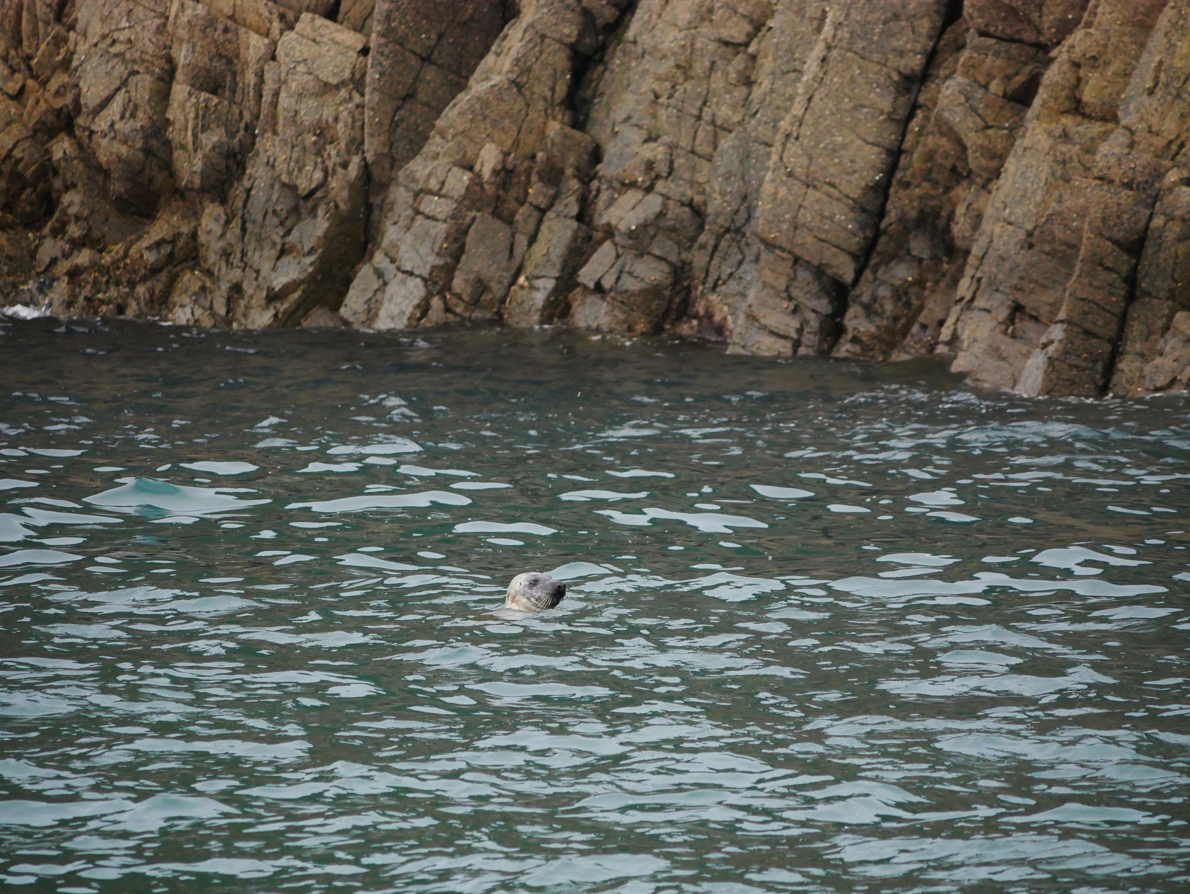 Nach einer kurzen Fahrt auf dem offenen Meer und ordentlich Seegang, sind wir dann mit dem Schiff an die Südseite von Skomer Island gefahren und dort haben wir dann auch die größere Brutstätte der Trottellummen gesehen. Ab und an mischte sich auch ein Tordalk dazwischen. Die beiden zu unterscheiden ist gar nicht so einfach, aber nach etwas Beobachtung sieht man den Unterschied dann doch ganz gut. Das beste Kennzeichen ist wohl der Schnabel und die weiße Linie am Kopf. Aber noch wichtiger, an der Südseite gelangen auch ein paar super Fotos der Puffins und nebenbei tauchte auch noch eine Robbe auf und luscherte ab und an aus dem Wasser.
