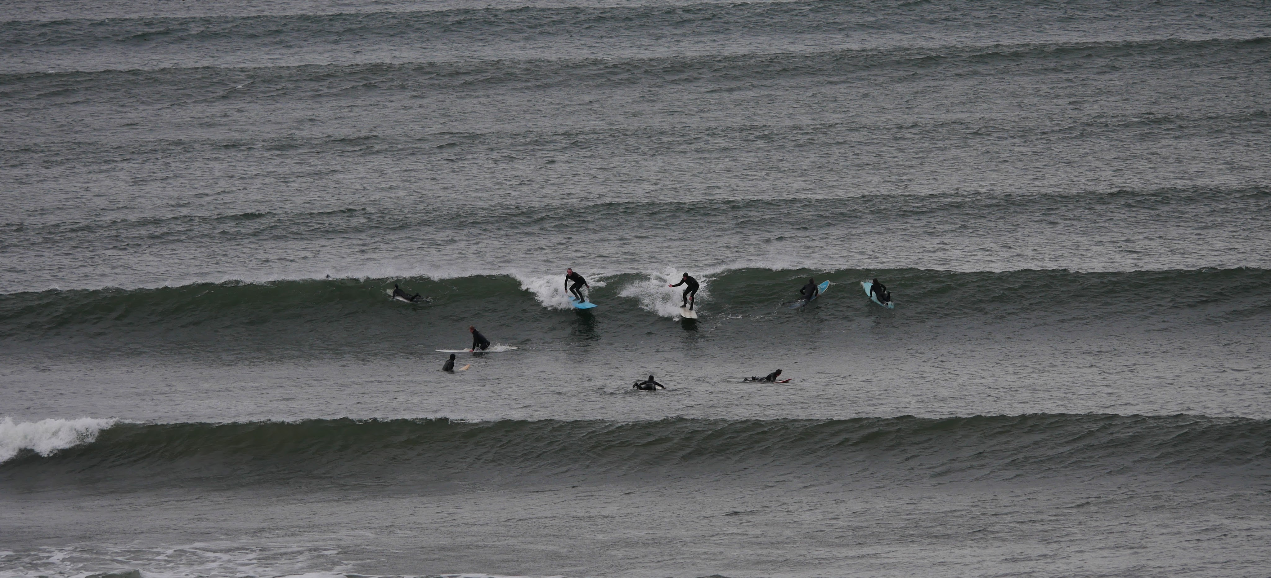 Fangen wir doch einfach da an, wo ich beim letzten Mal stehen geblieben war. Müsste Doolin gewesen sein, und so hieß es gestern dann auch Tschüssi Doolin und auf nach Dingle. Nach meinem Frühstück im AirBnB und einem nochmal fantastischen Ausblick aus dem Bett und vom Frühstückstisch auf den Atlantik machte ich mich gegen 10 auf den Weg, denn der war gar nicht so kurz. Ich fuhr also erstmal an die Tanke, weil die am Vorabend nicht mehr aufhatte und holte mir erstmal eine Ladung Sprit und da nach 27 Litern schon Schluß war, muss das Vehikel echt nen kleinen Tank haben. Aber gut, mit vollem Auto ging es dann Richtung Killimer, wo ich zur Fähre wollte. Doch vorher spottete ich noch einen dicken Strand und bog auf den Parkplatz ab und parkte das Auto. Mit Kamera bewaffnet stand ich oberhalb des Strandes und sah den vielen Surfern zu, wie sie sich ins Kalte Nass stürzten und versuchten die besten Wellen zu reiten. Den einen gelang das ganz gut, andere waren eher noch im Übungsmodus. Aber das ist auch ok, denn dort gab es mehrere Surfschulen. Da stand ich also ne Viertelstunde rum und beobachtete die Surfer. Mir wärs ja zu kalt, davon mal ab, das ohne nen Neoprenanzug das eh nicht möglich wäre. Auf jedenfall war das ganz interessant mal mit anzusehen. Wir hatten ja schonmal einen recht extremen Surfer gesehen auf Island…da is das Wasser ja noch kälter. Wer weiß, vielleicht haben die „Profis“ ja für Island geübt?
