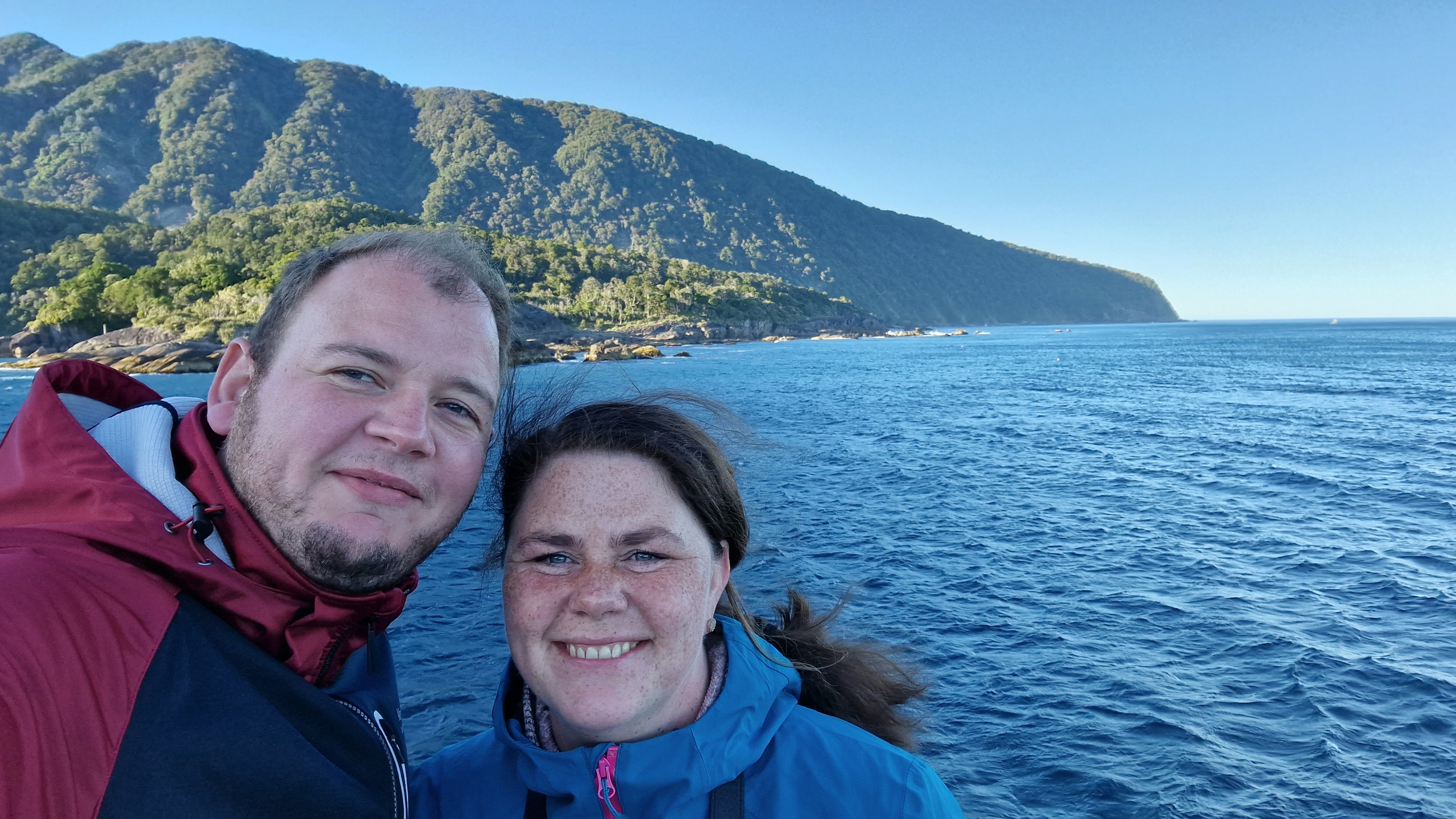 Um Mitternacht und als Letzte an Deck fielen wir dann in die Koje, denn am nächsten Morgen hieß es 6:45 Uhr „kaltes“ Frühstück. Zwar gab es auch ein warmes, doch das Schiff hatte sich schon in Bewegung gesetzt und so hieß es für uns Kaffee grabbeln und raus in die Sonne und aufs Sonnendeck, wo nur eine Handvoll Menschen bis jetzt war. Alle anderen verpassten meiner Meinung nach das beste an der Übernachtung auf dem Schiff…denn die See war ruhig, keine anderen Schiffe unterwegs und die Sonne lachte vom wolkenlosen Himmel. Der Nature-Guide erzählte wieder Sachen über den Sound, bis wir schließlich in der Tasmanischen-See ankamen, wo der Wind merklich auffrischte. Nach einer Drehung ging es dann wieder zurück, vorbei an ein paar Robben die faul in der Sonne lagen oder miteinander im Wasser spielten. Vorbei an den zwei großen Wasserfällen landeten wir gegen 9 Uhr wieder im Hafen, nachdem wir auch unsere Rechnung für die Getränke gezahlt hatten. Nun hieß es Abschied nehmen vom Schiff…