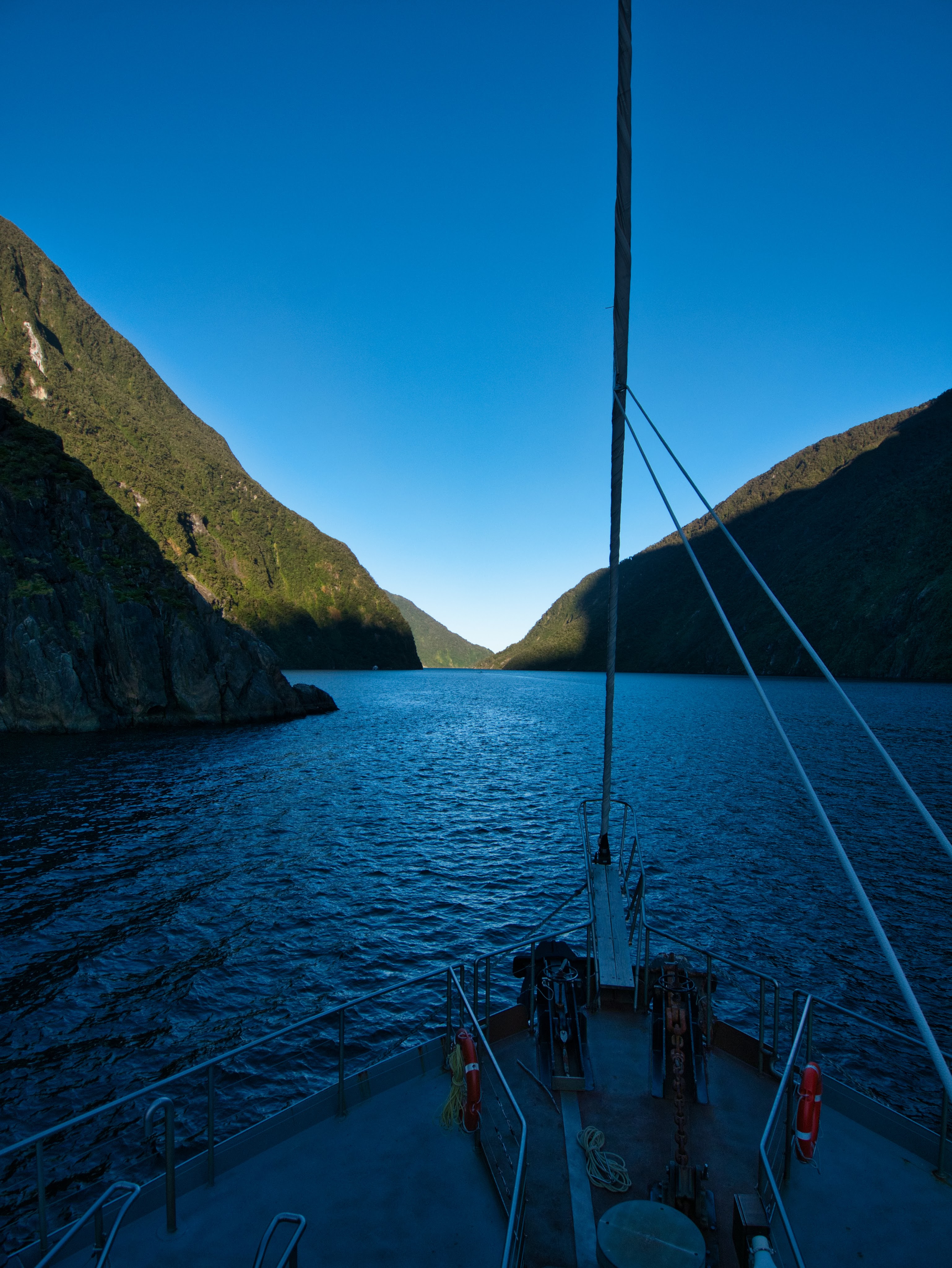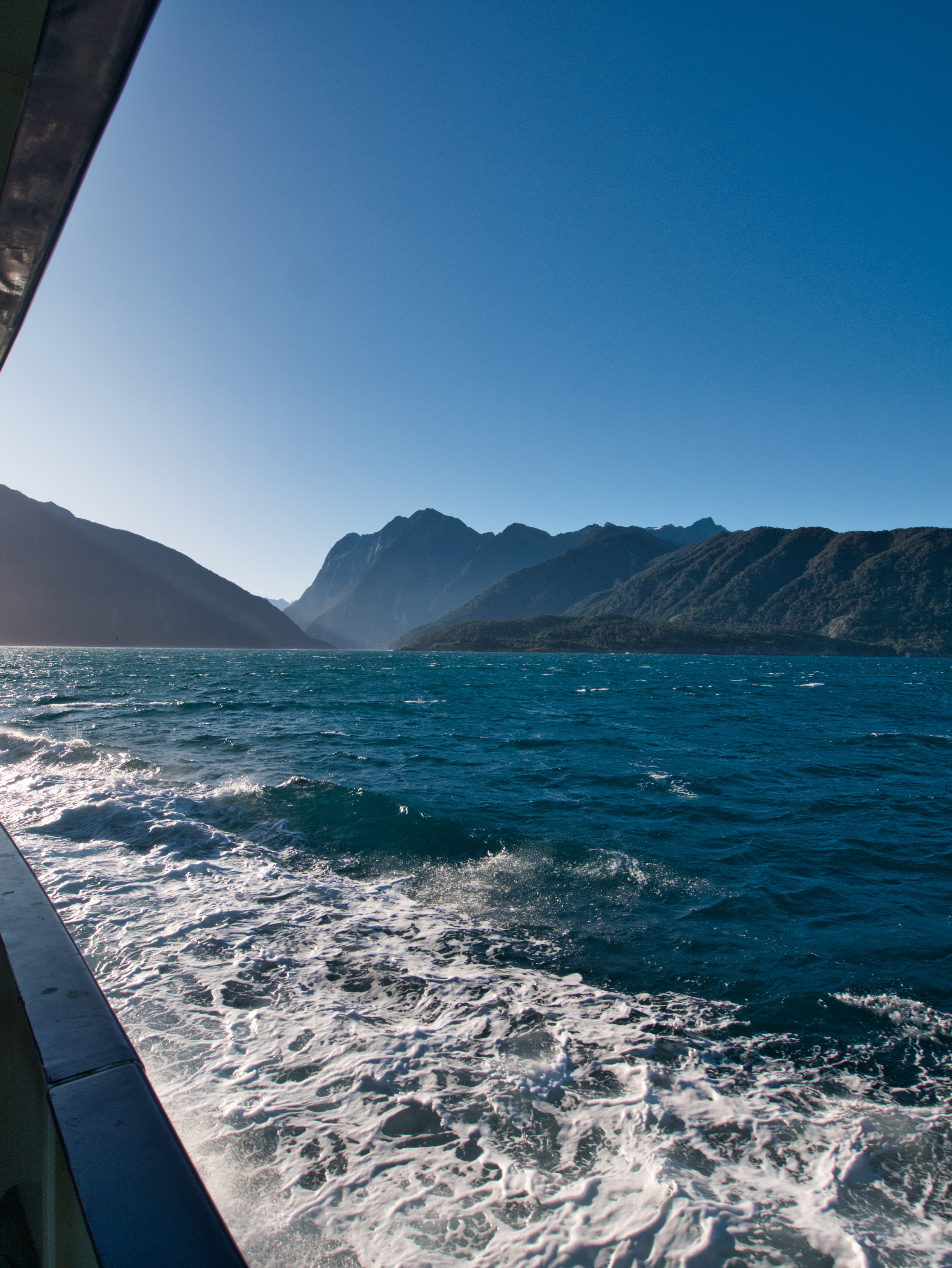 Dann ging die Fahrt gemächlich weiter, wenngleich wir schon einen Zahn hätten zulegen können. Wir hatten nämlich ein Date mit der Milford Mariner – einem „Segel“-Schiff, dass über Nacht auf dem Milford-Sound verbleibt und nicht im Hafen von Milford anlegt. Sprich, ein kleines Hotel. Und unser Check-In sollte um 15:45 beginnen, damit 16:00 Uhr das Schiff ablegen konnte. Da wir irgendwie uns etwas doof angestellt hatten, zahlten wir noch Parkgebühren von 50 NZD (~ 30 €) – zum aber Glück nicht gleich die volle Summe für die ganze Nacht, weil die dicken Finger das nicht hinbekommen haben. Als wir dann am Schiffsanleger ankamen und eincheckten und bzgl. dem Parken nachfragten, sagte man uns, wir könnten direkt auf ein paar abgesperrten Busparkplätzen am Terminal parken. Tja, also musste einer den ganzen Weg zurück und hat das Auto dann kostenfrei umparken können. Wie schon gesagt, haben uns wohl bissl dusselig angestellt und 50 NZD in den Wind geschossen. Aber sowas passiert halt mal. Das Gute war eigentlich, dass wir eben nur 50 und nicht 150 in den Wind gepfeffert hatten (was es bis zum nächsten morgen gekostet hätte). Aber nun waren wir startklar, die Zeit tickte runter, doch der Check-In wollte einfach nicht starten. Irgendwann gegen 16:15 Uhr ging es dann doch los, so dass alle Panik eigentlich umsonst war. Übrigens hatten sich mittlerweile auch die letzten Wolken verzogen, so dass uns die Sonne volle Möhre auf den Kopf brutzelte.