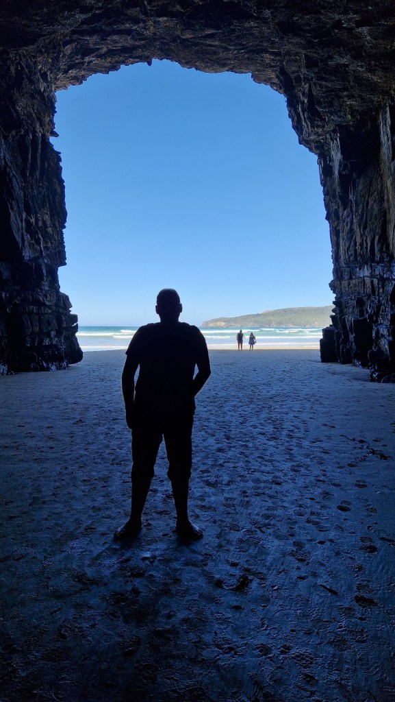 Am Strand angekommen, war aber die Brummellaune hinfort gewischt. Denn wir traten aus dem schattigen Busch ins gleißende Licht der Mittagssonne mit einem schneeweißen, breiten Strand und einem aufgewühlten Meer. UND – wenig Menschen. Wir mussten noch etwa 10 Minuten durch den Strandsand bzw. durch die Wellen waten bis wir bei der Höhle ankamen. Schon von etwas Entfernung konnte man den Eingang der Höhle gut erkennen. Zwei Höhlen, wovon eine etwa 30m hoch ist sind miteinander verbunden, aber wie das in Höhlen so ist, war´s etwas dunkel :p
