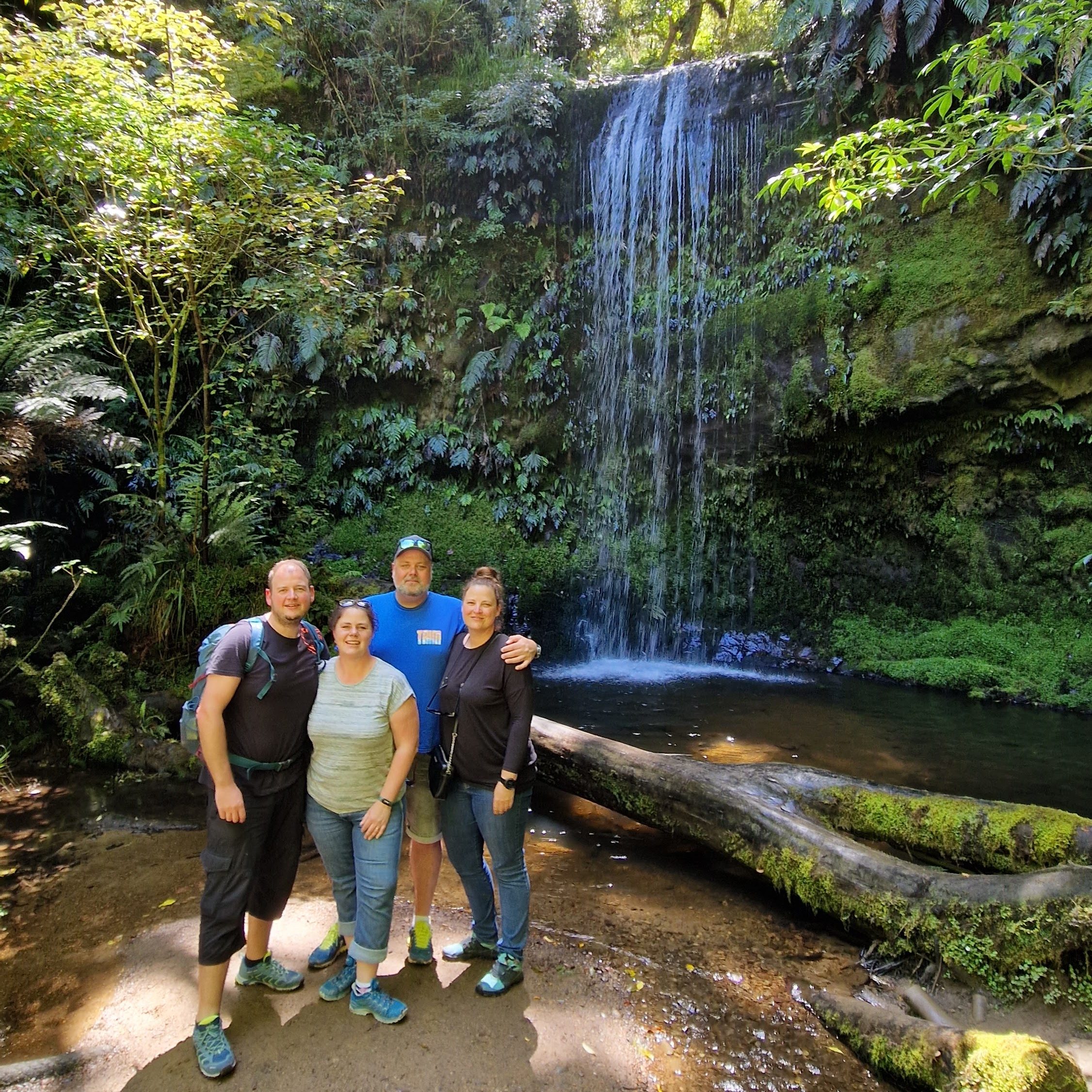 Durch dichtesten Dschungel mit einem Weg, der aus den Stämmen der Farne gebaut wurde, über glatte Steine, kleine steile Anstiege und Abstiege ging es tief in den Wald hinein, bis wir am Ende an einem kleinen, aber wirklich tollen Wasserfall ankamen. Wir waren dort ganz alleine, erst etwas nach uns kam noch ein Pärchen, das uns dann auch bei unserem Foto behilflich war. Da es kein Rundweg war, ging es den gleichen Weg natürlich auch wieder zurück.
