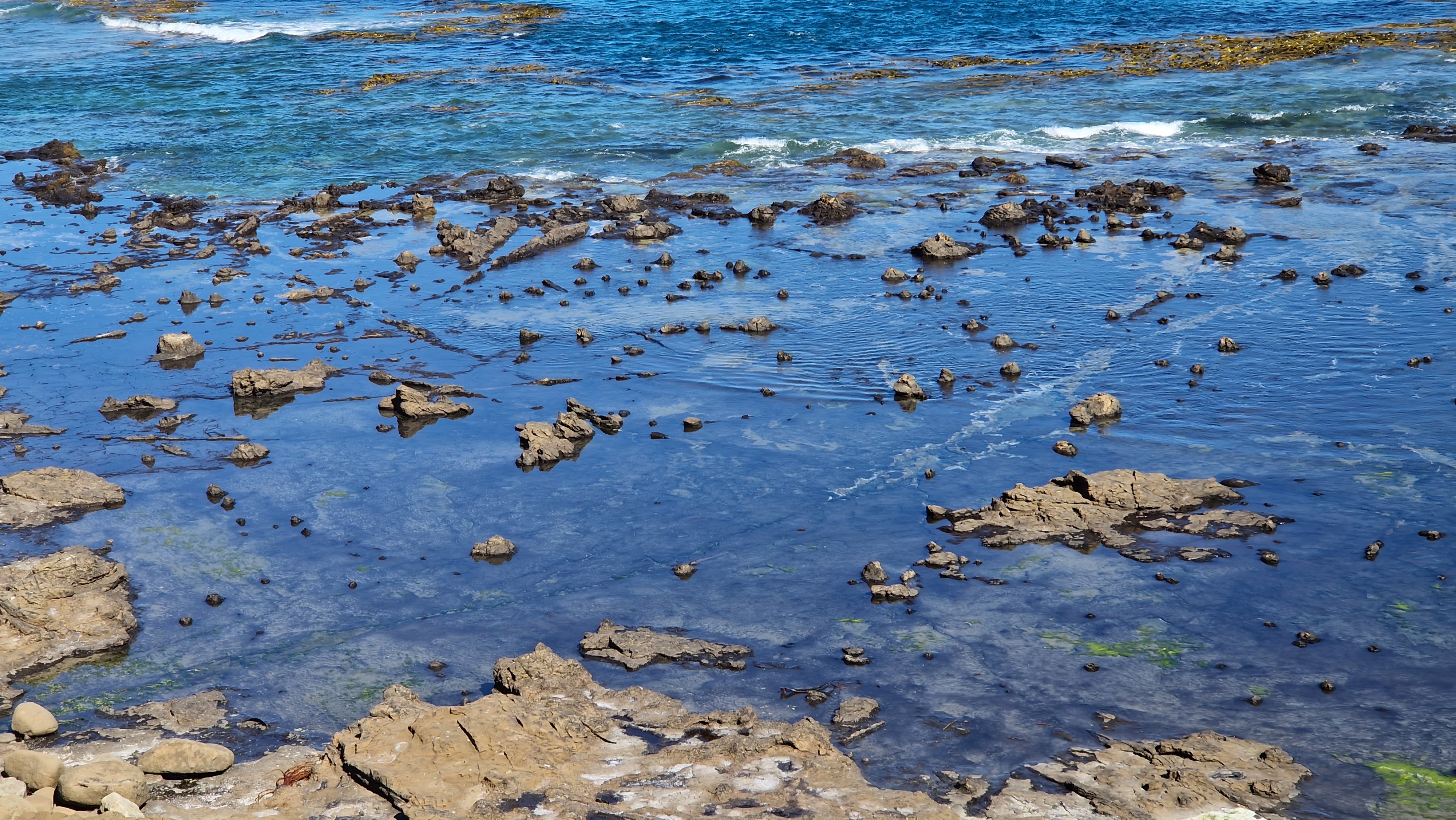 Nach dem Slope Point ging es Richtung Curio Bay. Dort wollten wir versuchen Pinguine zu sehen und uns den versteinerten Wald anschauen. Das Plateau, dass wir auch sehen konnten und vor allem bei Ebbe sichtbar ist, zeigt die Überreste eines versteinerten Waldes. Die Überbleibsel stammen aus dem Jura und sind damit etwa 180 Millionen Jahre alt. Damals war Neuseeland noch Teil des Großkontinents Gondwana und die Region der Catlins bewaldet. Bei mehreren Schichtfluten vulkanischen Materials wurde der Wald mehrfach zerstört, wodurch sich schichtweise Ablagerungen bildeten. Durch die Erosion an der späteren Küstenlinie wurden Sandstein und andere Gesteine abgetragen, sodass die inzwischen versteinerten Überreste der Pflanzenwelt freigelegt wurden. Ein paar Infos hab ich hier von Wiki gemopst. Da wir zur Abendzeit da waren, war der Strand gesperrt, denn unterhalb einiger Aussichtsplattformen nisten die Gelbaugenpinguine, die wir aber auch hier leider nicht antrafen. Doch auch von oben konnte man ein bisschen erahnen, wie der Wald aussieht, bzw. sieht man teilweise die umgefallenen Baumstämme. Es ist ein bisschen wie ein Suchspiel, aber mit dem Handy leider kaum anders möglich. Dafür haben uns die Sand-Flies so richtig überfallen hier, deshalb hieß es alsbald abhauen, da wir kein Mückenspray dabei hatten.