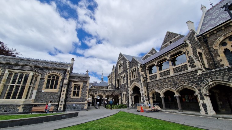 Das sieht bisschen komisch aus, aber hier erkennt man auch ganz feine Linien im Bild. Es handelt sich um eine Kunstinstallation eines lokalen Bildhauers namens Neil Dawson. Die Skulptur ist schon 1981 das erste Mal installiert worden und sollte eigentlich nur eine kurzzeitige Installation werden, doch es wurde recht populär, so dass es immerhin 9 Monate hing bevor es durch einen Unfall kaputt ging. Erst zehn Jahre später, also 1991 wurde es wieder aufgebaut und als feste Installation wieder im Stadtbild integriert. Durch das Erdbeben 2011 wurde es jedoch wieder komplett zerstört. Im Dezember 2021 fand es wieder seinen Weg in die bzw. hinter das Kunstzentrum in Christchurch. Also wieder 10 Jahre nachdem es kaputt ging. Es hat also in seinen knapp 40 Jahren schon einiges hinter sich…Leider sieht man den Innenhof nicht, denn der Künstler hatte sich bei dem Entwurf an die neugotische Architektur der umgebenden Gebäude orientiert.