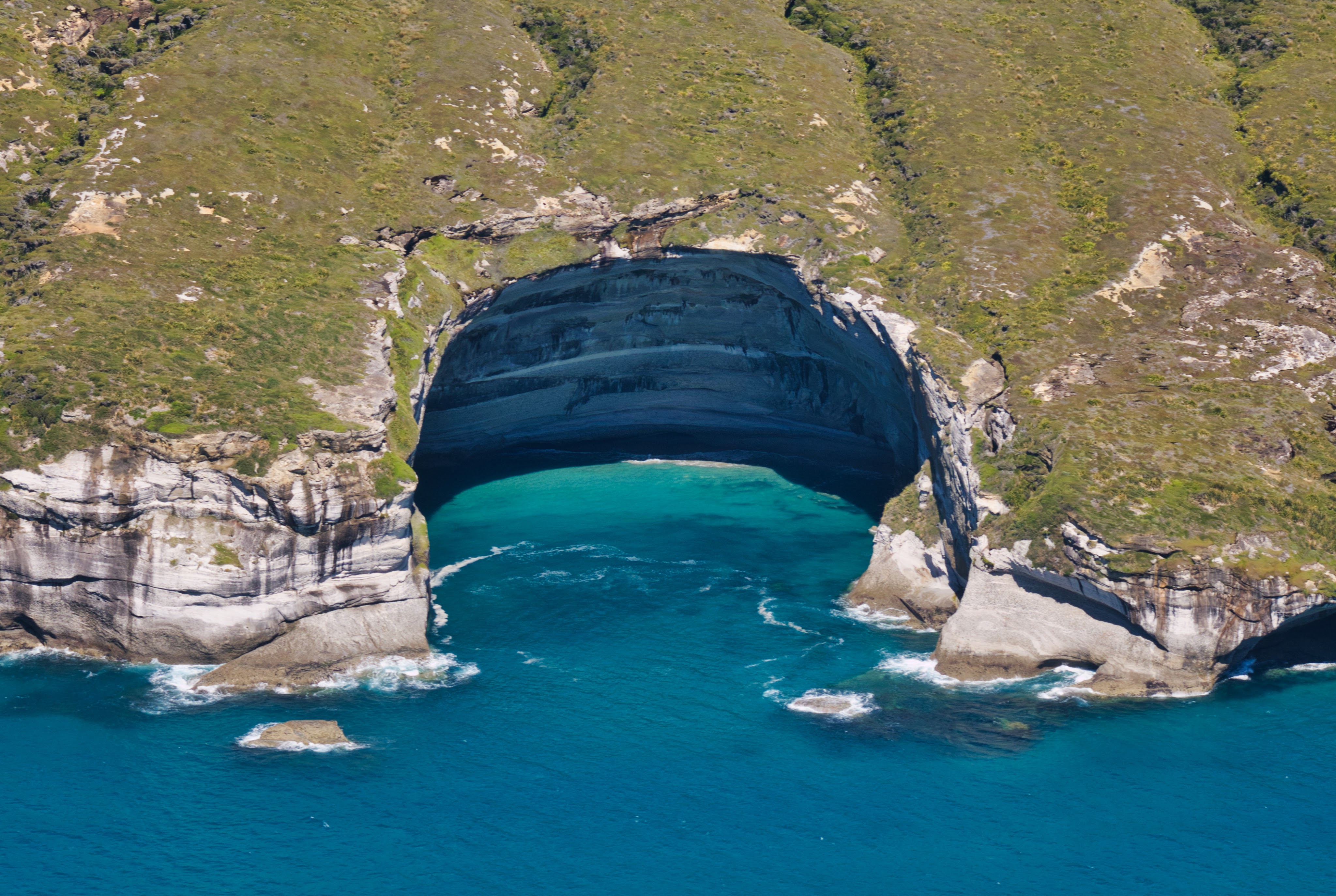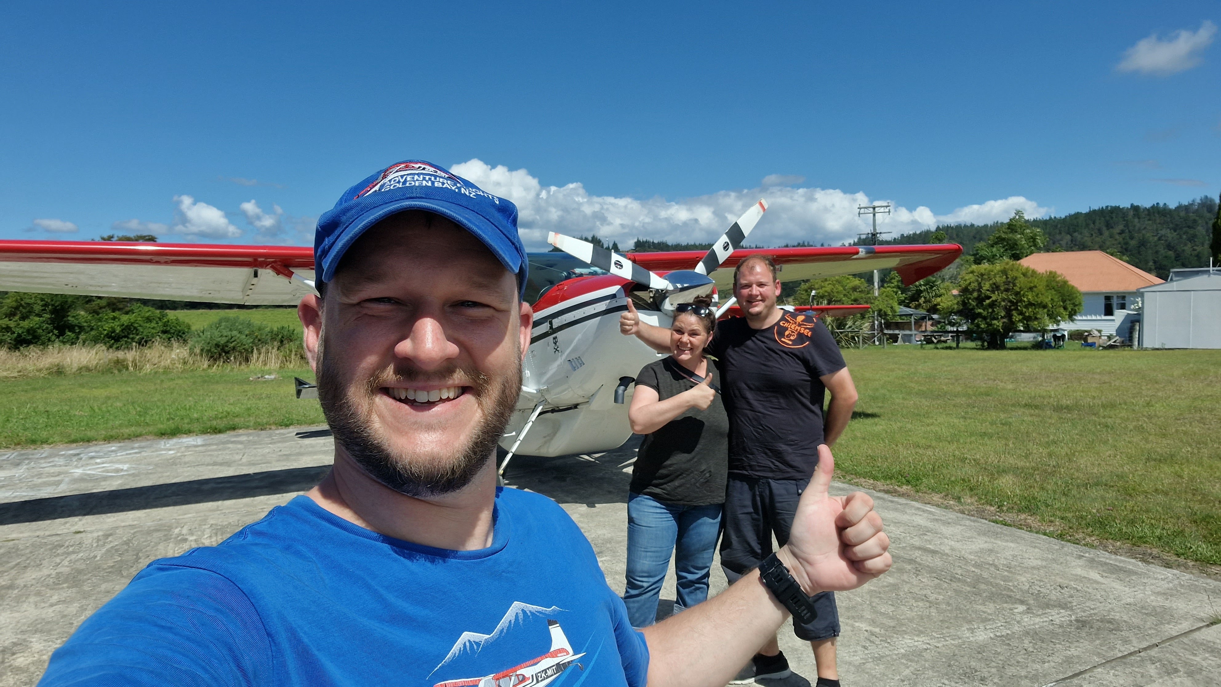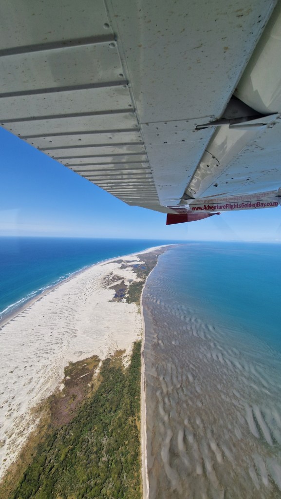 Die Entscheidung war auch ganz gut, weil Stefan am nächsten Tag arg von Fräulein Migräne geplagt wurde und bis Mittags nicht so recht aus dem Bett kam. Von daher war das Verschieben der Tour wirklich eine gute Idee und so fuhren wir auch erst so los, dass wir um 14:45 in Takaka auf dem Flugplatz/Hafen ankamen. Direkt neben dem kleinen Häuschen stand noch ein Haus, wo Mit dann rauskam und uns in den Flieger einlud. Wir erzählten, dass wir vor 5 Jahren schon mal da waren und mit ihm geflogen sein. Wir entschieden uns für eine Tour entlang der Westküste – unter anderem mit Überflug über den Wharariki Strand. Und was sollen wir sagen… Nachdem der Morgen recht grau gestartet ist, hatten wir Sommer, Sonne, Sonnenschein und ein paar Wolken über den Bergen, die Takaka und die Westküste voneinander trennten. Lassen wir einfach Bilder sprechen!