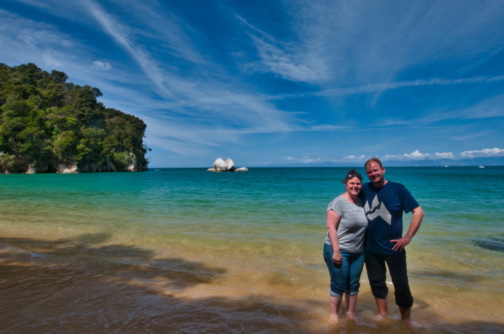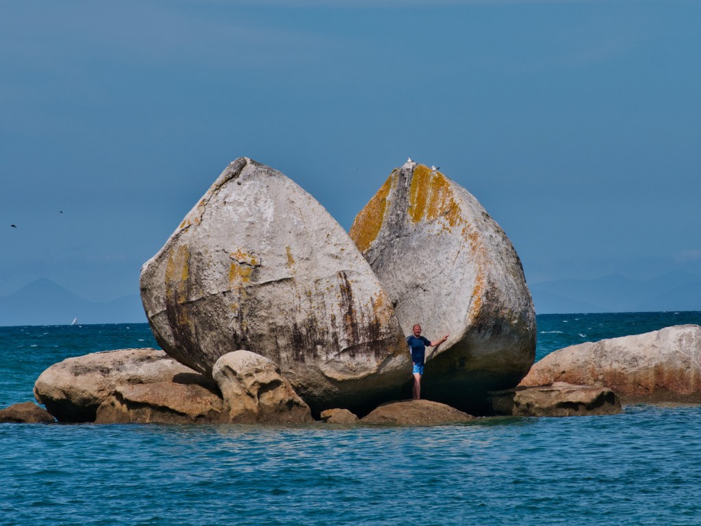 Nach unserer kleinen Kreuzfahrt wollten wir noch zum Split Apple Rock (Gespaltener Apfelstein), was wir auch taten. Ein kleiner Fußmarsch durch den Busch und schon standen wir an einem sehr leeren Strand. Ein paar andere hatten sich ebenfalls hierhin verirrt, hatte aber mit bedeutend mehr Menschen gerechnet. Einige waren ins kühle Nass gesprungen und ein paar hatten sich sogar auf den Weg zum Stein gemacht. Da grade noch Flut war, war der Strand recht schmal, so dass wir, um eine gute Position zu haben, ein bisschen durchs Wasser warten mussten. Doch kein Problem, Schuhe und Socken aus, Hose hochkrempeln und los ging es. War jetzt auch kein mega Marsch, sondern nur um einen umgekippten Baum herum. Hinter dem Baum hatten wir dann ein paar Steine gefunden, wo wir unsere Sachen ablegen und auch Fotos machen konnten. Da wir cleverer Weise unsere Badesachen mitgenommen hatten, hieß es nun, Sachen runter und ab in das türkisfarbene Wasser. Es war nicht wirklich warm, aber eisig war es auch nicht. Und da lagen wir nun im Wasser und haben bisschen rumgeschwimmelt. Das Wasser war aber salziger, als ich gedacht hatte und so schmeckte jeder Schluck entsprechend. Die Devise hieß also: Kein Wasser schlucken. Stefan bemühte sich dann, per 10 Sekunden Auslöser ein paar Fotos zu machen, was gar nicht so einfach war, denn Ebbe hatte bereits eingesetzt und der Weg ins Wasser wurde immer länger.