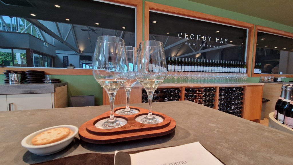 Da ich bei Wein immer sehr auf´s Etikett schaue, fiel die Wahl auf das Weingut Cloudy Bay. Die hatten nämlich bei ihrem 2022 Sauvignon Blanc einen Teil der Flasche mit geprägt. Sieht spektakulär aus die Flasche. Daher wollte ich da unbedingt hin. Aber bevor wir dort reintrudeln, vielleicht noch ein paar Fakten zum Weinanbaugebiet.