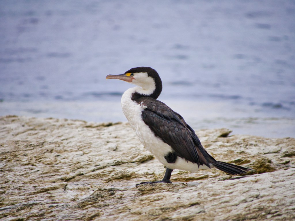 Doch was nun? Das Wetter wollte nicht so recht aufklaren, also entschlossen wir erstmal frühstücken zu gehen. Das taten wir dann auch im Zentrum von Kaikoura. Im Why Not Café aßen wir, mal wieder, pochierte Eier, und überlegten uns, was wir mit dem grauen Tag anfangen. Wir entschieden uns, statt nach Walen ausschau zu halten, für eine Wanderung entlang der Küstenlinie zu den Seebären-Kolonien. Auch da hatten wir 2018 schon gemacht, fanden es damals aber schon toll und so fuhren wir nach dem Frühstück direkt zum Kean Point. Dort parkten wir auf einem wirklich vollen Parkplatz. Ich war etwas überrascht, wobei ich es mir auch hätte denken können, denn alle Rundflüge aber auch Wassersportsachen, wie z.b. Surf-Schulen wurden natürlich abgesagt. Ob Schiffe rausgefahren sind, wußten wir nicht, aber da hier viel los war, wohl eher nicht. Und so entschieden nicht nur wir uns für die Wanderung, sondern auch viele andere. Wir packten also unsere Sachen zusammen und marschierten los. Wir brauchten eine Weile, bis wir zu den Seebären kamen und es war wie beim letzten Mal – Unmengen an Tieren lagen auf den Felsen und diesen Küstenabschnitt. Viele faul, aber einige waren auch aktiv und schwammen eine Runde. Neben den Seebären gab es auch viele Vögel. Natürlich Möwen, aber auch Kormorane und Enten, die sich teilweise für uns extra schön in Pose setzen.