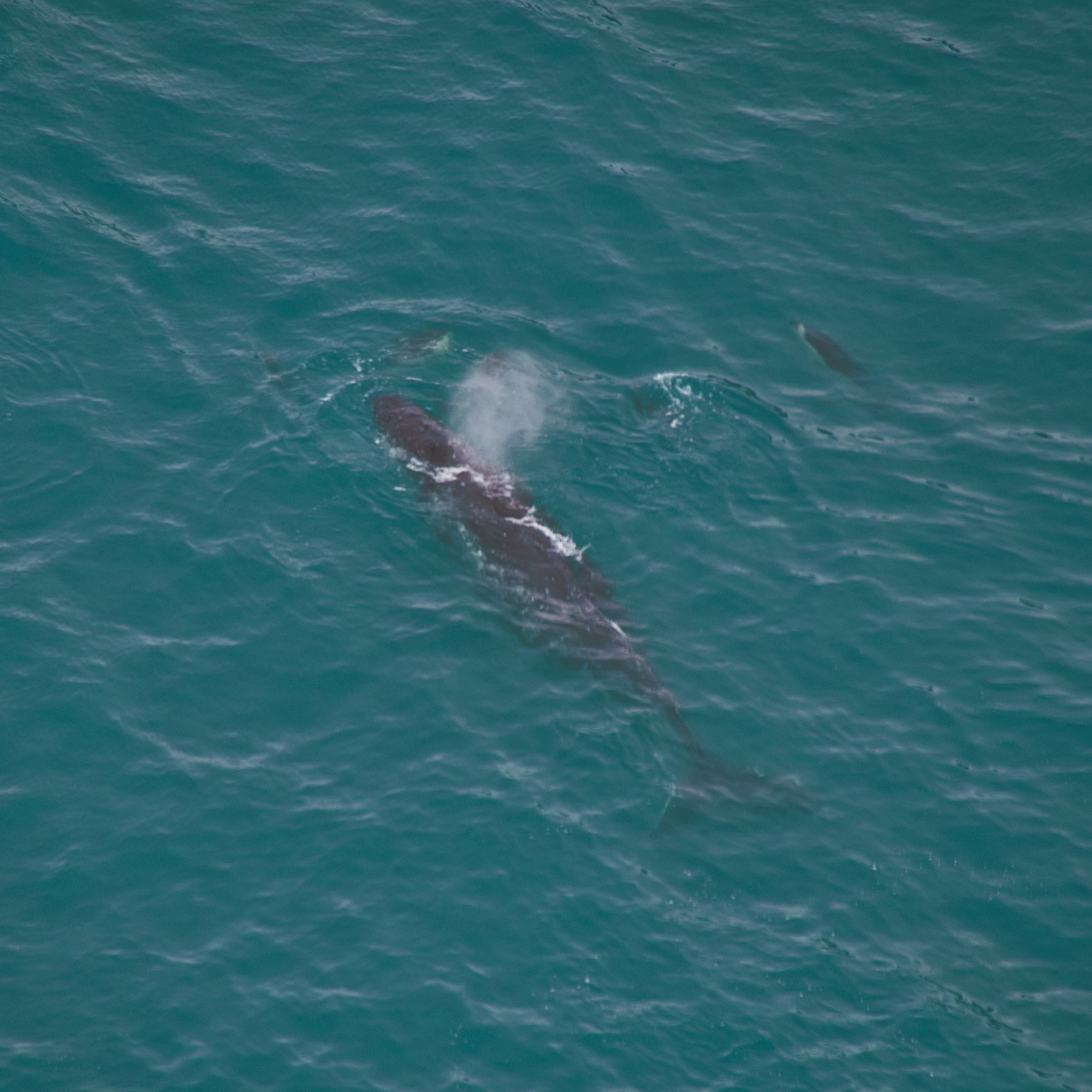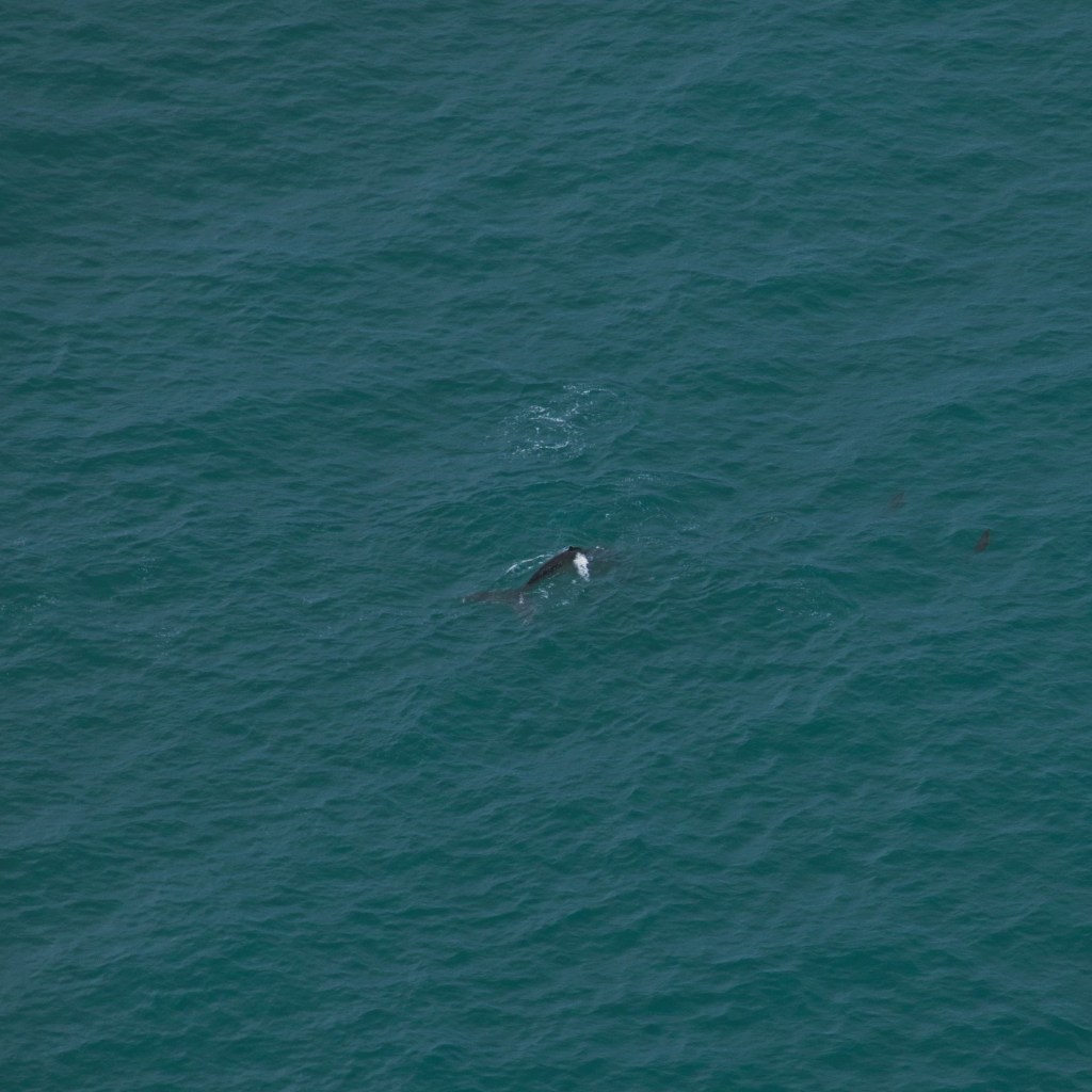 Und Tatsache, da war ein Wal, im Schlepptau einige Delfine und unsere Pilotin erklärte und, dass die Delfine mit dem Wal spielen und es sich um einen noch jüngeren Wal handelt, da er nicht ganz so groß ist. Es war dann auch tatsächlich ein Buckelwal, leider wollte er aber nicht hüpfen, so wie man es sonst oft sieht. Ein etwas schüchterner Riese, der aber ganz gelassen mit den Delfinen seinen Weg schwamm. Wie schon erwähnt, kreiselte das Flugzeug dann über dem Wal und Delfinen, was aber das fotografieren erschwerte und mir ein mulmiges Gefühl in den Bauch trieb. Da war ich am Ende aber nicht alleine. Einem Mädel ging es nach der Landung nämlich ziemlich schlecht. Nachem wir gefühlt eine halbe Stunde über dem Wal gekreiselt sind, kam über Funk die Meldung, dass eine große Gruppe Delfine etwas entfernt von Kaikoura gesichtet wurde, wo wir dann hinflogen. Und große Gruppe meinte hier so um die 300 Tiere oder mehr. Es war ein wirklich riesiger Pulk und auch wenn man das mit der Kamera nicht so recht einfangen konnte, ab und an konnten wir einen hüpfen sehen.