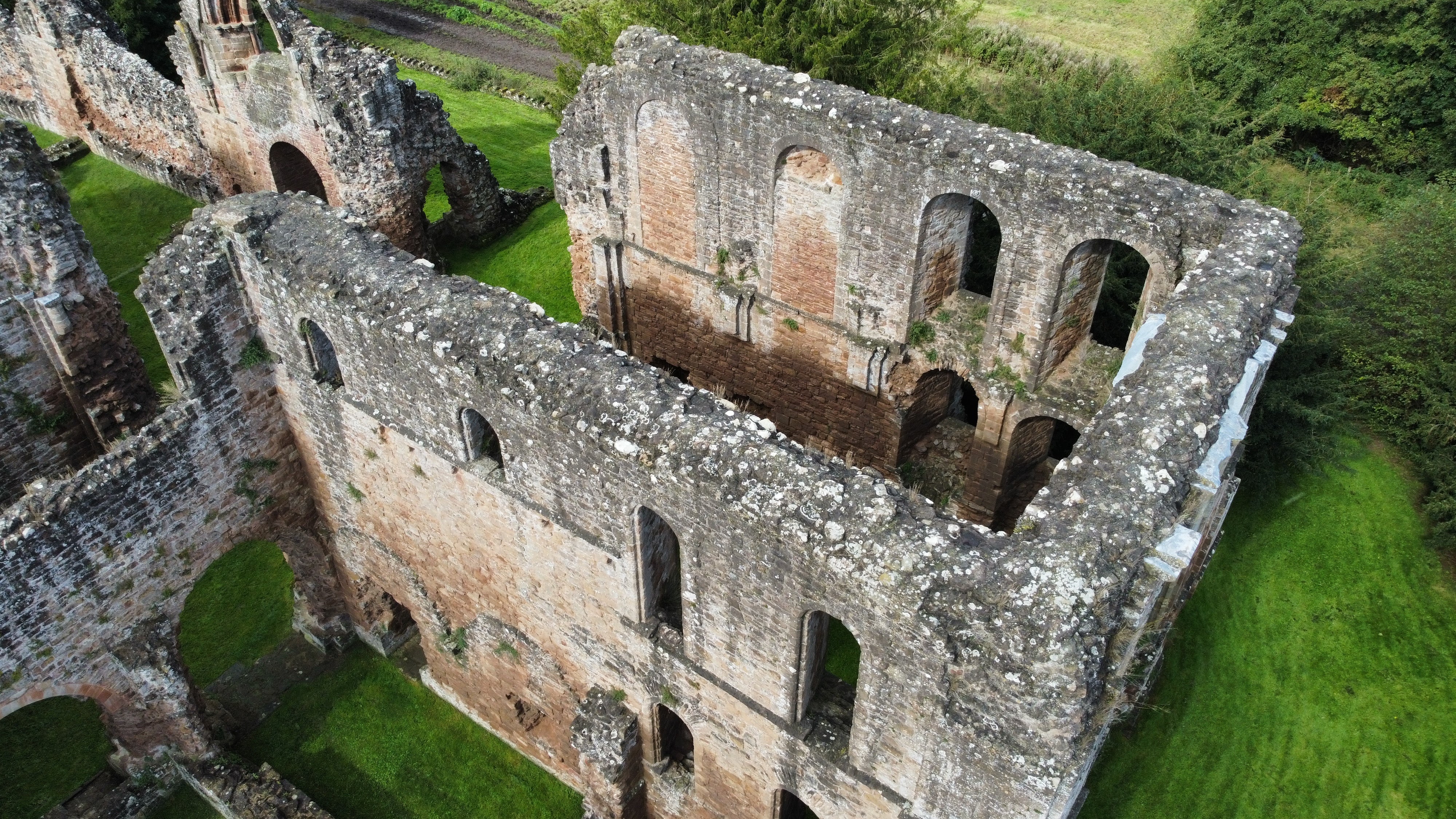 Nachdem wir in Ironbridge auch noch etwas gegessen und einen Kaffee getrunken hatten, ging es weiter Richtung Norden. Wir hielten noch an einer etwas versteckten Abbey, wo es nicht mal einen Parkplatz gab, wir aber kurz die Drohne aufsteigen lassen konnten. Da wir aber nur noch wenig auf dem Akku hatten, blieb leider nicht viel Zeit für einen großen Rundflug, daher nur schnell hoch, klickklick und wieder runter. Aber immerhin konnten wir einmal von oben luschern…