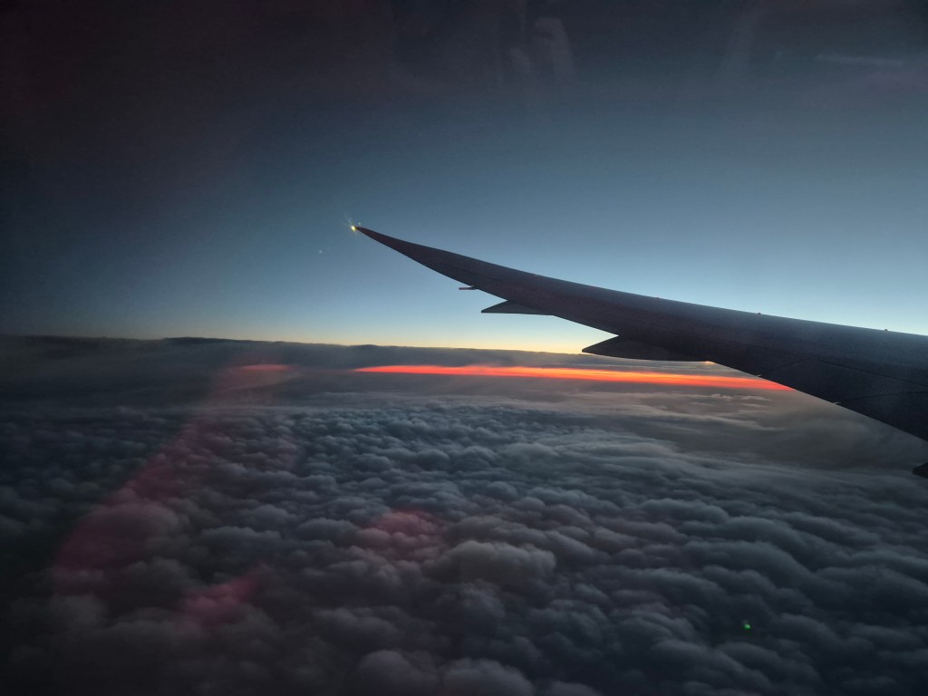 Also sind wir zum Schalter und haben gefragt, ob man da was machen kann. Und das ging. So saßen wir zwar immer noch links, aber direkt hinter der Premium Eco, so dass wir gefühlt 100 m Beinfreiheit hatten. Und wir hatten den dritten Platz frei, der war nämlich in einem Knick, wo die Stewardessen immer schön gegengeknallt sind. Da kannste normal auch echt niemanden hinsetzen. Für mich ja nicht ganz so wichtig, aber für Stefan war das schon weitaus besser. Und so gabs dann nach dem Boarding erstmal schön was zu futtern bevor es dunkel im Flieger wurde, da wir ja in die Nacht bzw. durch die Nacht flogen. Nach vielem Wandern im Flieger, Filmen und Serien und einem Frühstück ging es dann auch langsam an die Landung.