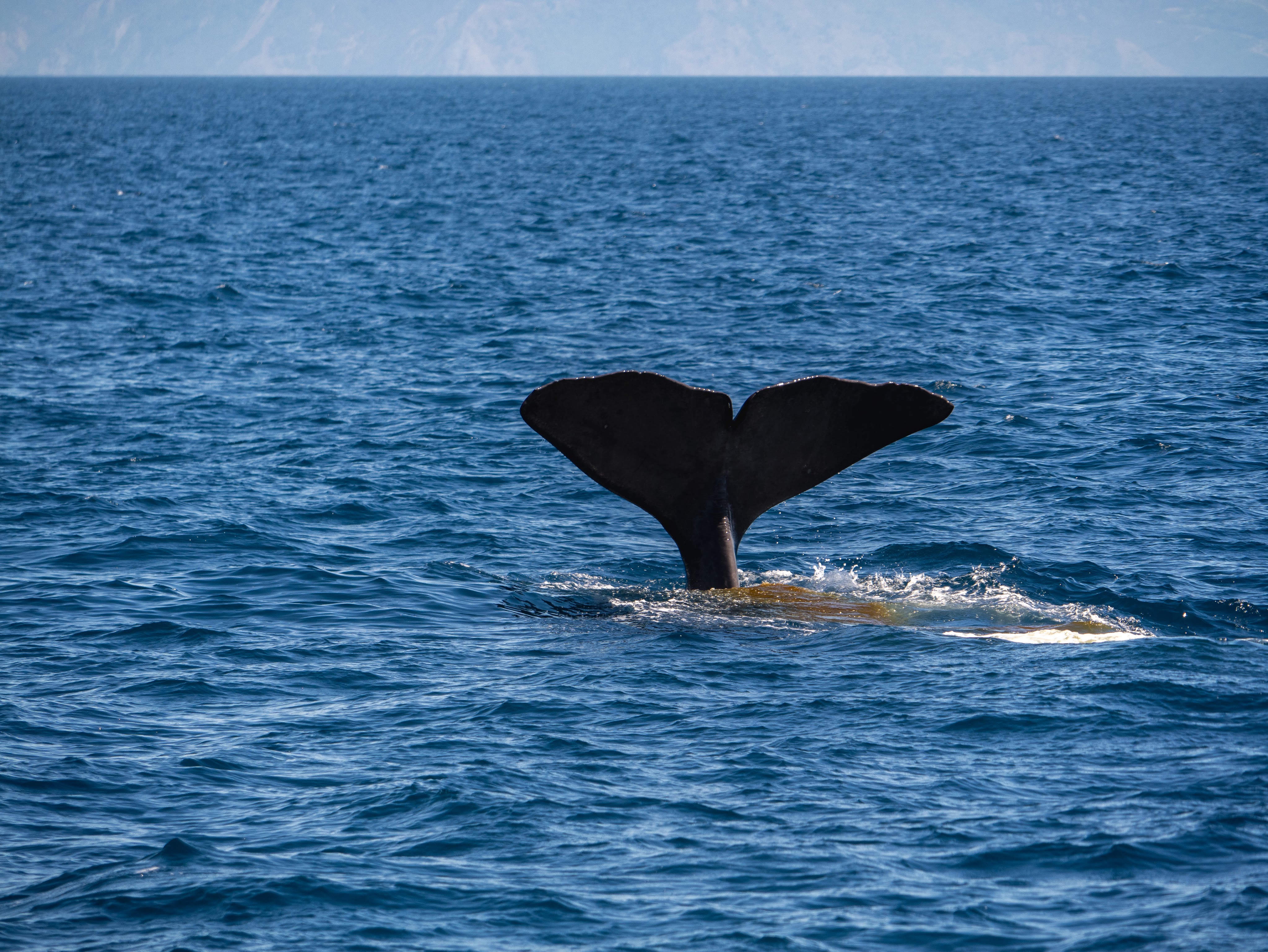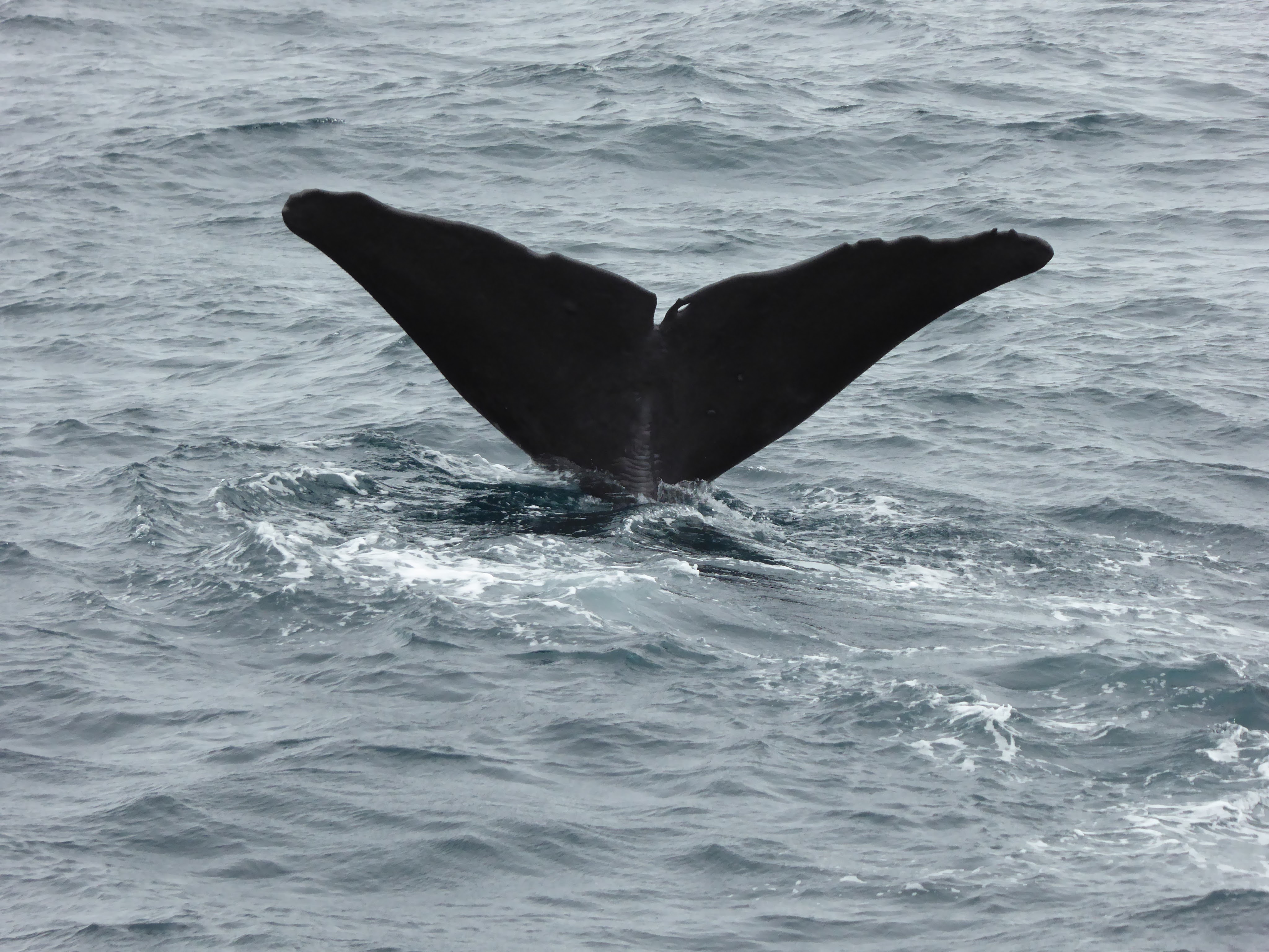 Hier kann man auch schön sehen, wie unterschiedlich die Fluke ist und das beim Buckelwal das Blasloch oben mittig, beim Pottwal aber schräg links sitzt. Übrigens der einzige Wal, bei dem es links sitzt.