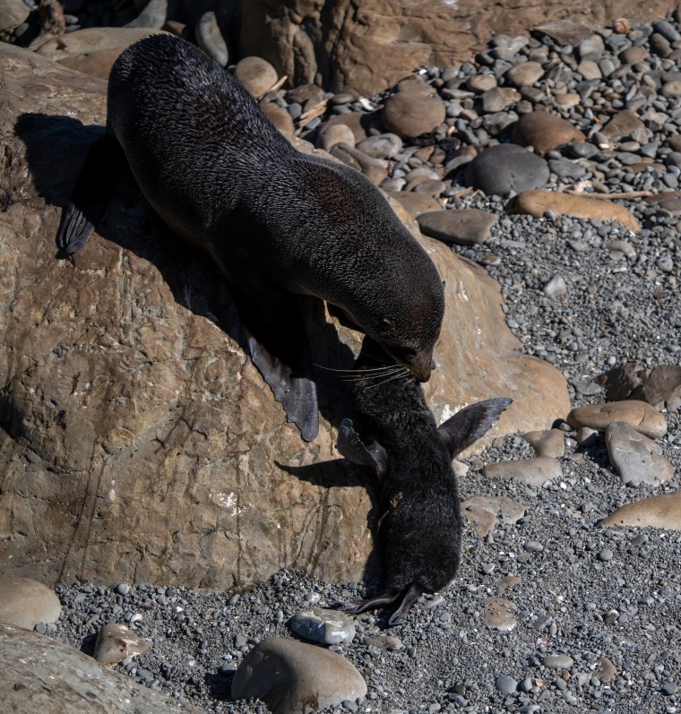Wir hatten ja gesagt, dass wir eigentlich in die Unterkunft wollten, aber entschieden uns dann doch dagegen und fuhren an der Küste entlang Richtung Half Moon Bay in nördlicher Richtung. Da hatte Stefan eine kurze Wanderung rausgesucht zu einem Aussichtspunkt am Berg, von wo man dann natürlich auf die Küste schauen konnte. Angekommen, sind wir dann den Berg hochgestapft, ich eher brummeln, aber verraten wir keinem. Oben angekommen, haben wir dann natürlich auch zwei drei Bilder gemacht, aber es war an sich weniger Urwald, als wir gedacht hatten. Daher haben wir uns da gar nicht so lange aufgehalten und sind dann mit dem Auto wieder zurück Richtung Unterkunft. Auf dem Weg und auf unserer Seite lagen dann noch einige Aussichtspunkte, die wir dann auch angesteuert haben. Neben einfachen Aussichtspunkten mit verschiedenen Maori-Figuren, hielten wir auch noch an einer Bucht, wo eine Menge Robben rumlagen. Hier tummelten sich auch wieder eine Vielzahl von Jungtieren. Der ein oder andere ist noch nicht so geübt im Klettern, so dass Mutti nachhelfen muss. Doch so richtig wie bei einer Katzenmutti funktioniert es dann doch nicht. Und auch das ist Natur, hat es das ein oder andere Jungtier nicht überlebt. Und dann streiten die Bullen an anderer Stelle so heftig, dass einige wirklich viele und schwere Blessuren davon getragen haben.