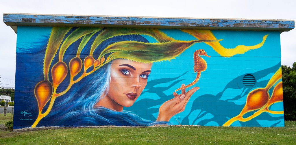 In Invercargill angekommen sind wir erstmal noch kurz zum Spätstücken gegangen im The Batch. Ein super tolles Café, mit Anstehen und überhaupt, aber super Futter und Kaffee natürlich. Da auch dieser Tag wieder sehr grau war, hatten wir unseren Laptop dabei, denn wir haben echt mit dem Gedanken gespielt, die Flucht einzuschlagen und auf den großen Nachbarn rüber zufliegen. Nach langen hin und her uns aber doch eingeredet, dass die Sonne auf jeden fall nochmal zu uns zurück kommt (kleine Spoiler: heute, 26.12. – ein Lichtblick). Also: Laptop weggepackt, Essen aufgefuttert, Kaffee geleert, Handy gezückt, Streetart-Karte geöffnet, ab zum Auto und die Kamera einsatzbereit gemacht. Dann fuhren wir kreuz und quer durch Invercargill und grasten so viel wie möglich ab, was uns gefiel und nachdem die Karte fast komplett abgehakt war, ging es dann doch endlich Richtung Kaka Point. Doch nun hieß es noch zu entscheiden, ob wir an der Küste oder durch das Inland fahren. Wir entschieden uns für die Küste und so fuhren wir im matschigen grau als erstes zum Waipapa Point Lighthouse. Und ja, den haben wir schon gemacht und nun das dritte Mal. Aber bis jetzt war das immer ein toller Ort und es bestand natürlich die Chance, hier Seelöwen zu sehen. Im aktuell altbekannten Grau kamen wir dort dann auch an und liefen Richtung Strand und dort lagen auch schon zwei. Die hatten sich sehr gern, auch wenn sich das Männchen etwas angestellt hat. Wir blieben ein paar Minuten stehen und gingen dann weiter, um die Tiere nicht weiter zu stören. Demnächst könnte es aber an diesem Strand junge Seelöwen geben 🙂