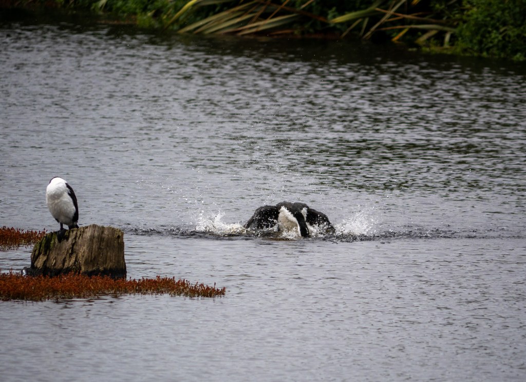 Von Bluff ging es nach dem Frühstück direkt los und wir begannen damit, unsere kleine Street-Art-Tour in Bluff noch zu beenden, bevor wir nach Invercargill weiterfuhren, wo wir ebenfalls noch eine Karte gefunden haben mit vielen Street-Art-Bildern, die wir dann auch noch machen wollten. Nachdem wir Bluff quasi geschafft hatten, den Großteil hatten wir am Tag davor ja schon angeschaut, ging es weiter durch nichtssagendes Land, wo wir aber am Straßenrand einen Weiher sahen, wo eine ganze Horde/Herde/Kolonie an Kormoranen nistete und seine Jungen aufzieht. Da mussten wir natürlich nochmal umdrehen und schauen, was da so los ist. Leider waren sie dann doch ein bisschen zu weit weg, aber ein Jungtier hab ich erwischt, wie er noch kläglich an seinen Flugversuchen scheitert…