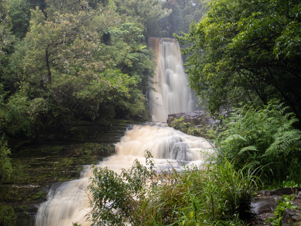 In den Catlins gibt es neben diesen tollen Naturerlebnissen noch viel anderes zu entdecken, zum Beispiel Wasserfälle, wovon wir auch schon eine Menge gemacht haben. Einen hatten wir aber auf jeden Fall noch offen und den wollten wir uns anschauen. Auch wenn das Wetter eigentlich dagegen sprach, fuhren wir zu den McLean Wasserfällen. Bereits auf dem Parkplatz wurden wir dann auch erstmal von einem kleinen Graumantelbrillenvogel (hier auch Silvereye oder Wachs-Eye genannt) begrüßt. Dann liefen wir durch einen dichten Wald mit wieder vielen Baumfarnen (da wir wieder mehr an der Küste waren) und einigen umgestürzten Bäumen, denn auch hier muss es ordentlich Regen gegeben haben in den letzten Tagen. Und so liefen wir entlang des Tautuku River und irgendwie kam uns das Wasser farblich etwas komisch vor. Es war zwar klar, aber wieder sehr rotbraun, statt eisblau oder blau. Der McLean Wasserfall hat mehrere Kaskaden, wo das Wasser drüber läuft und dann standen wir schon vor einer größeren Kaskade und dachten, boa, ja geschafft, aber Pustekuchen. Es ging noch ein paar steile Treppen hinauf und dort „startete“ der Wasserfall. Auf den Bildern sieht man es auch ganz gut, das Wasser hat eher eine Cappuccino-Farbe. Wir können es uns nicht so recht erklären, warum die Farbe so zustanden kommt. Wie dem auch sei, insgesamt hat der Wasserfall eine Höhe von 22m, also nicht so klein und es kam, eben auch durch den vielen Regen, recht viel Wasser runter. Das sieht man auch bei einer Langzeitbelichtung…