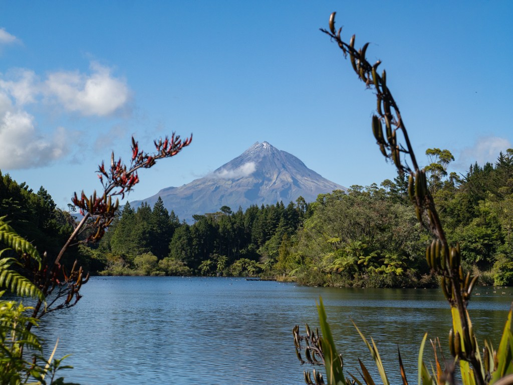 Der nächste Tag sollte ein sonnenverwöhnter Tag werden, zumindest so die Vorhersage. Und so machten wir uns schon recht zeitnah auf den Weg. Wir hatten uns diesmal einen anderen Aussichtspunkt für Taranki rausgesucht, doch bevor wir dahin fuhren, machten wir nochmal einen Abstecher zum See Mangamahoe. Und wir hatten Glück, zum einen war nichts los und zum anderen konnten wir den Vulkan tatsächlich ohne Mütze sehen, zwar nicht als Spiegelung, aber mit dem See im Vordergrund, ein Träumchen, oder?