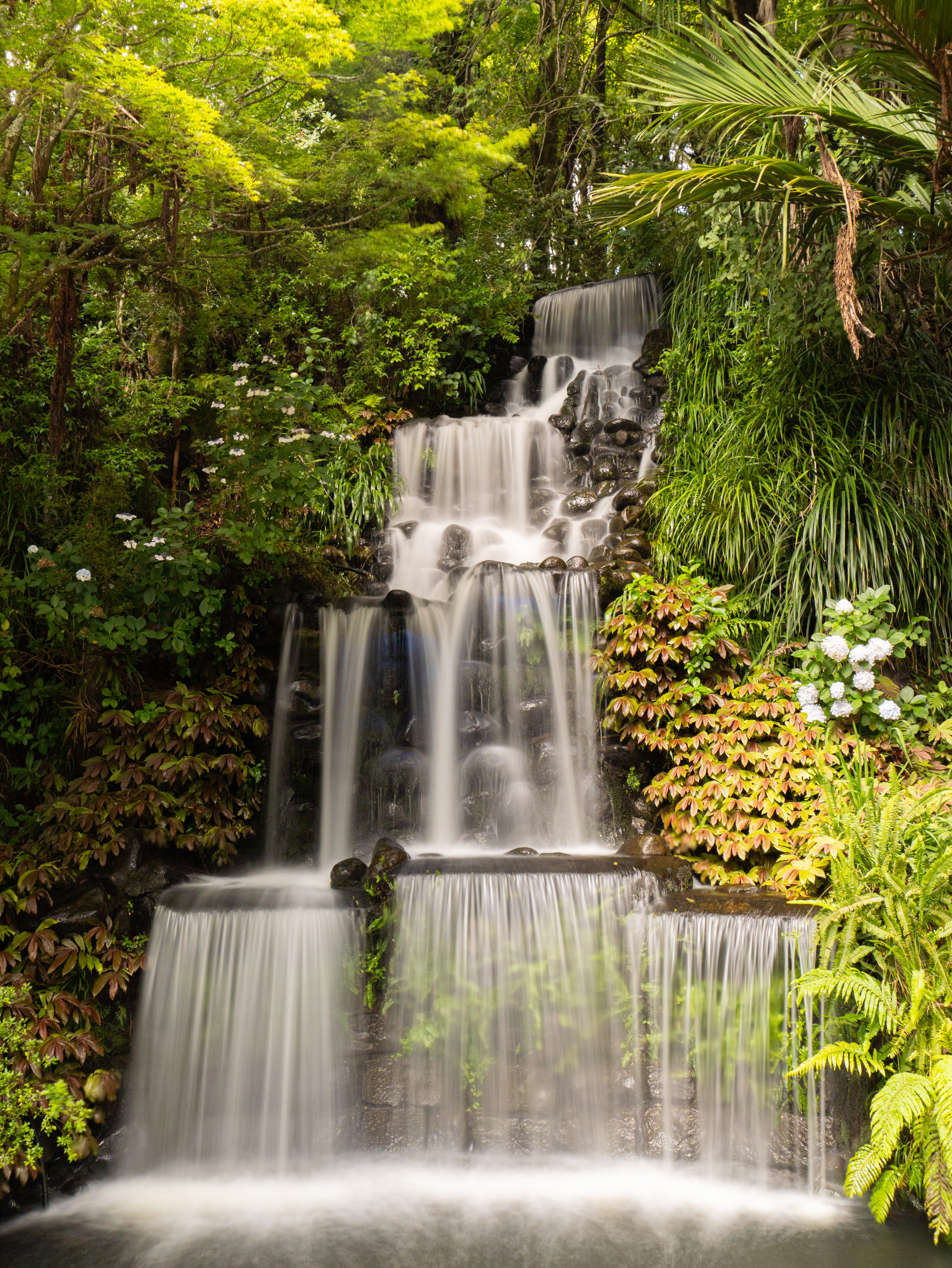 Am Ziel angekommen, erwartete uns ein voller Parkplatz, eine tiefhängende Wolkendecke und Nebel. Aber wir ließen uns nicht abschrecken, zogen unsere wettertauglichen Klamotten an und stiefelten frohen Mutes los. Doch schon als wir auf den ersten Weg einbogen, direkt in den Regenwald rein, war der Mut ziemlich davongeblasen. Der Untergrund war eigentlich nur eine große Pfütze, so dass wir grad mal 100m weit kamen, bevor wir uns entschlossen, den direkten Weg zum Wasserfall zu nehmen. Eigentlich wollten wir von unten auf den Wasserfall gucken, nun aber „mußten“ wir den kürzeren Weg nehmen, der uns zu einer Aussichtsplattform führte, wo man von oben auf den Wasserfall schauen konnte. Da war zum Glück auch nicht so viel los, so dass wir das ein oder andere Bild mit Langzeitbelichtung machen konnten. Wir überlegten noch, ob wir die Treppen, die hinunter führten, laufen wollten, entschieden uns aber dagegen. Also packten wir unsere Sachen zusammen, nachdem wir uns den Berg zum Parkplatz hochgequält hatten, und fuhren in einen der offenen Gärten: „Hollard Gardens„.