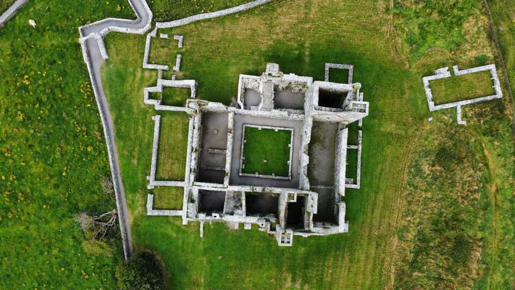 Zuerst wollten wir uns das Kloster Moyne anschauen. Wir haben aber schon auf dem Weg dahin ein bisschen Bewertungen gelesen, dass es schwierig ist, dort hinzukommen. Und dann standen wir vor dem Gatter, wo aber leider auch kein Parkplatz war. Um zum Kloster zu gelangen, hätten wir irgendwo parken müssen, über das Land eines Bauern laufen, was ja im Normalfall kein Problem ist, an einem Bullen vorbei – was durchaus ein Problem sein könnte, um dann zum Kloster zu gelangen. Also entschieden wir, wir lassen es und machten uns auf dem Weg zum nächsten Halt. Doch nachdem wir den Miniwald durchquert hatten und wieder ringsrumschauen konnten, sahen wir die Abbey aus einiger Entfernung. Und schau mal an, wir haben ja die Drohne mit. Sprich, Drohne startklargemacht und direkt drüber geflogen. Natürlich ist das nicht das gleiche, zumal die Bewertungen besagten, dass die Ruine wirklich toll ist, aber eben auch, dass der Bauer nicht so begeistert von Touristen ist. Und als Bulle wäre ich das übrigens auch nicht 🙂